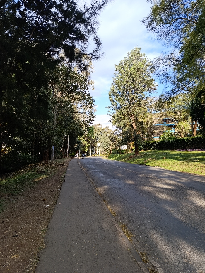 The image displays an asphalt road and an adjacent paved sidewalk, framed by dense, mature trees under a partially cloudy blue sky. The scene is located within the University of Nairobi's Main Campus in Nairobi, Kenya, identifiable by a multi-story building with blue exterior paneling visible through the trees in the far background on the right. The paved sidewalk occupies the left side of the frame, with an unpaved dirt verge and scattered debris to its immediate left. The asphalt road extends from the foreground into the distance, exhibiting tree shadows across its surface. Dense deciduous and coniferous trees line both sides of the road, forming a canopy overhead. On the right side, a grassy embankment slopes upward towards additional trees and, further back, the aforementioned university building. One individual is observed walking on the sidewalk in the mid-ground, moving away from the viewer. A second individual is visible further down the road, operating a motorcycle in the direction of the viewer. Two white rectangular signposts are partially visible on the right side of the road in the mid-ground. The environment is well-lit by natural daylight.