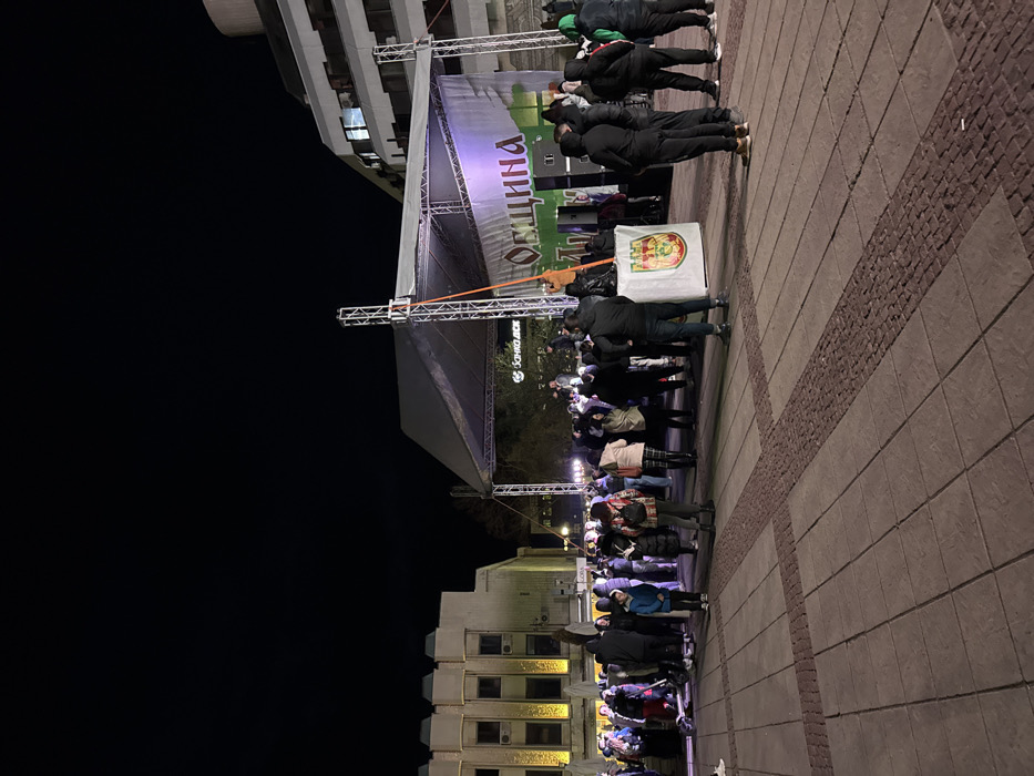The image depicts a nighttime outdoor scene in a paved public square in Dupnitsa, Bulgaria