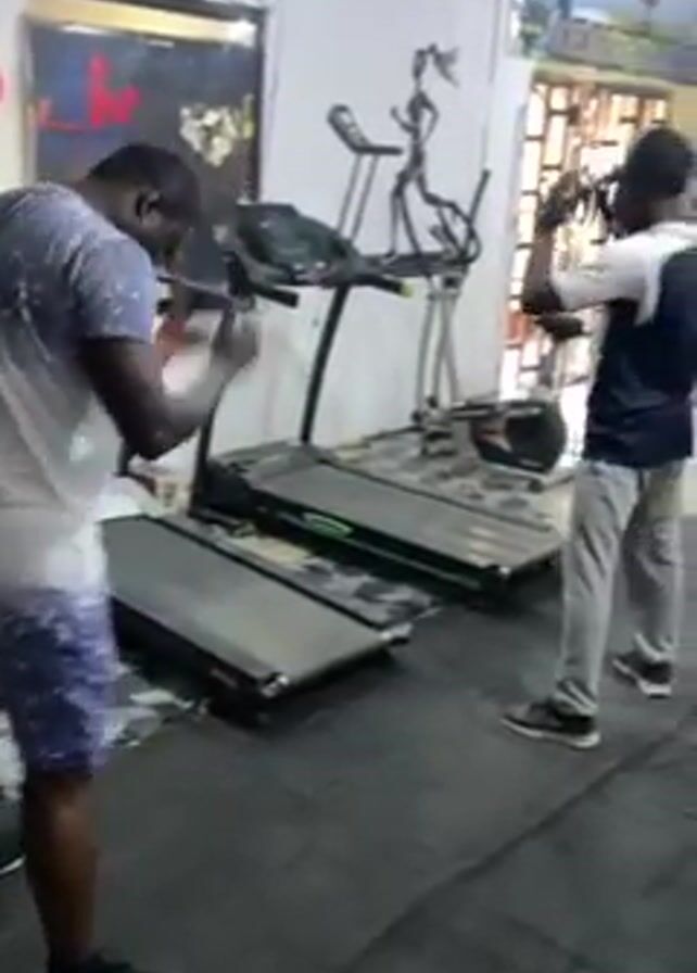 Inside a gym, a man dressed in a white and blue shirt with blue shorts and black shoes is seen from the rear view shadowboxing and then performing a stretch. There are three other individuals in the gym; another man in a grey outfit standing and exercising, a man with a weight bar on his shoulders performing squats on an elevated platform, and a woman bent over in a purple top stretching. Two treadmills are in the middle of the room, and there are several other weightlifting stations. On the wall is a sign that reads, "JOLCAS FOOTBALL ACADEMY" in large letters.