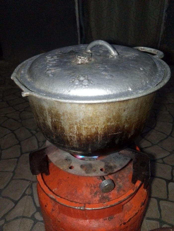 An aluminum pot with a lid rests on a portable propane stove. The pot's exterior is visibly stained with dark marks. The stove, colored in red, shows signs of wear and tear. A small flame is visible underneath the pot, indicating it's actively being used for cooking. The background is shadowed, suggesting an indoor setting.