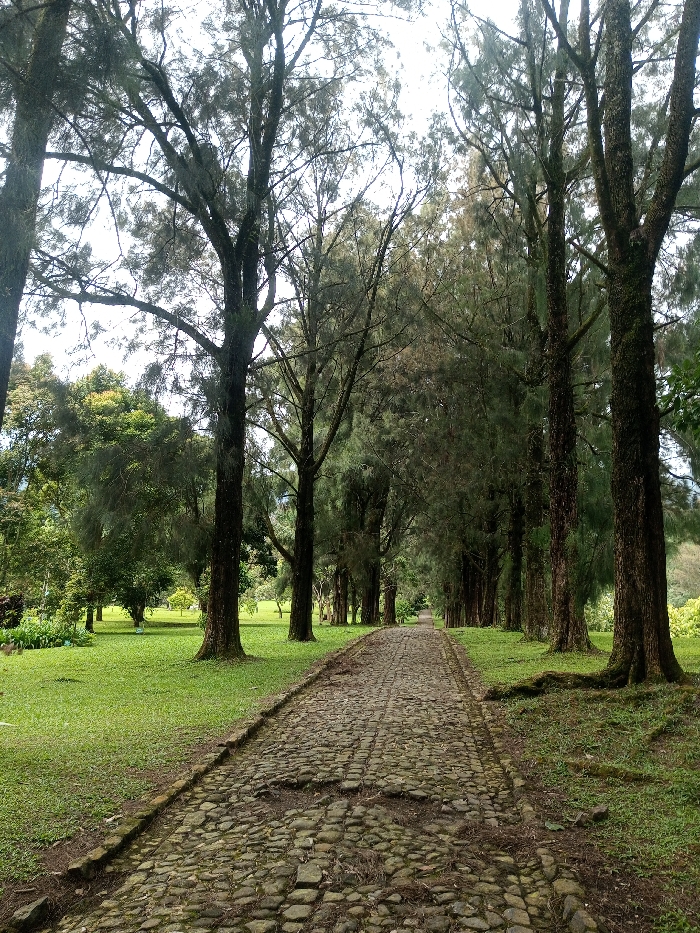 - "A cobblestone path stretches through a park-like setting, flanked by tall, slender trees with dense, dark foliage" by FM-zA7uI2, licensed under CC BY 4.0
