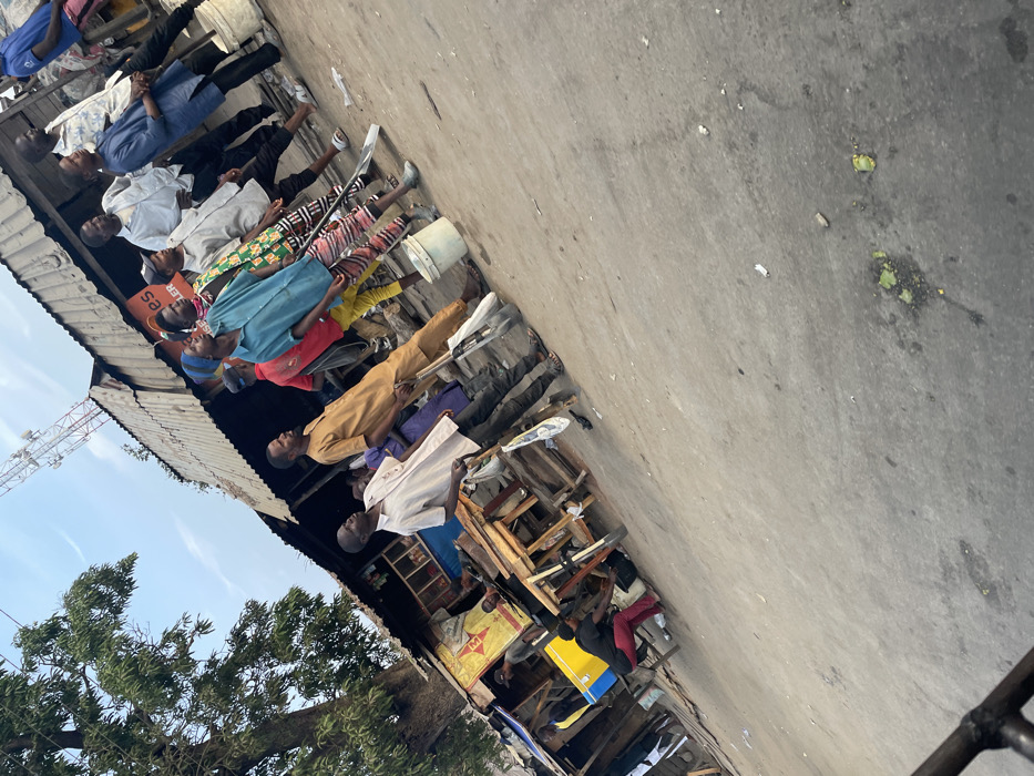 A row of men sit outside a building, some on wooden chairs and benches. They face left, each appearing to observe something out of view. They wear varied clothing, from dress shirts and trousers to more casual attire, with some in traditional fabrics. In front of them, a concrete surface is visible, marred with scattered debris. A tree's branches are visible on the left, partially obscuring a section of the sky. Overhead, a corrugated roof extends along the building's length. A communication tower is visible above the roof.