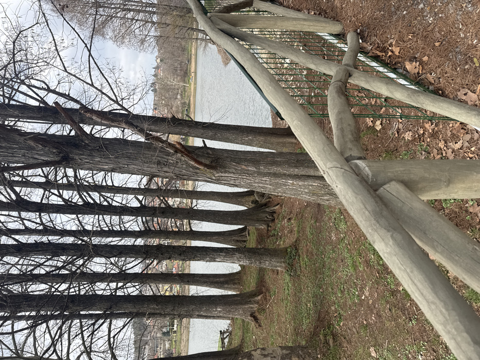 The image depicts a natural landscape scene in Nikolovo, Bulgaria, overlooking a lake under an overcast sky. In the foreground, a rustic wooden fence, constructed from irregularly shaped logs, extends diagonally from the lower left to the center-right. A green wire mesh barrier is visible directly behind the wooden fence. The ground covering in the foreground consists of exposed brown soil, an accumulation of brown pine needles and fallen deciduous leaves, interspersed with sparse patches of green grass. A distinct line of tall, slender trees with bare branches, exhibiting smooth, dark bark and slightly flared bases, stands along the immediate edge of the calm, grey-surfaced lake. Across the lake, in the background, a residential area or village with multiple buildings featuring reddish-brown rooftops is visible nestled into a gently sloped, tree-covered hillside. No human subjects, animals, or active events are present within the frame.