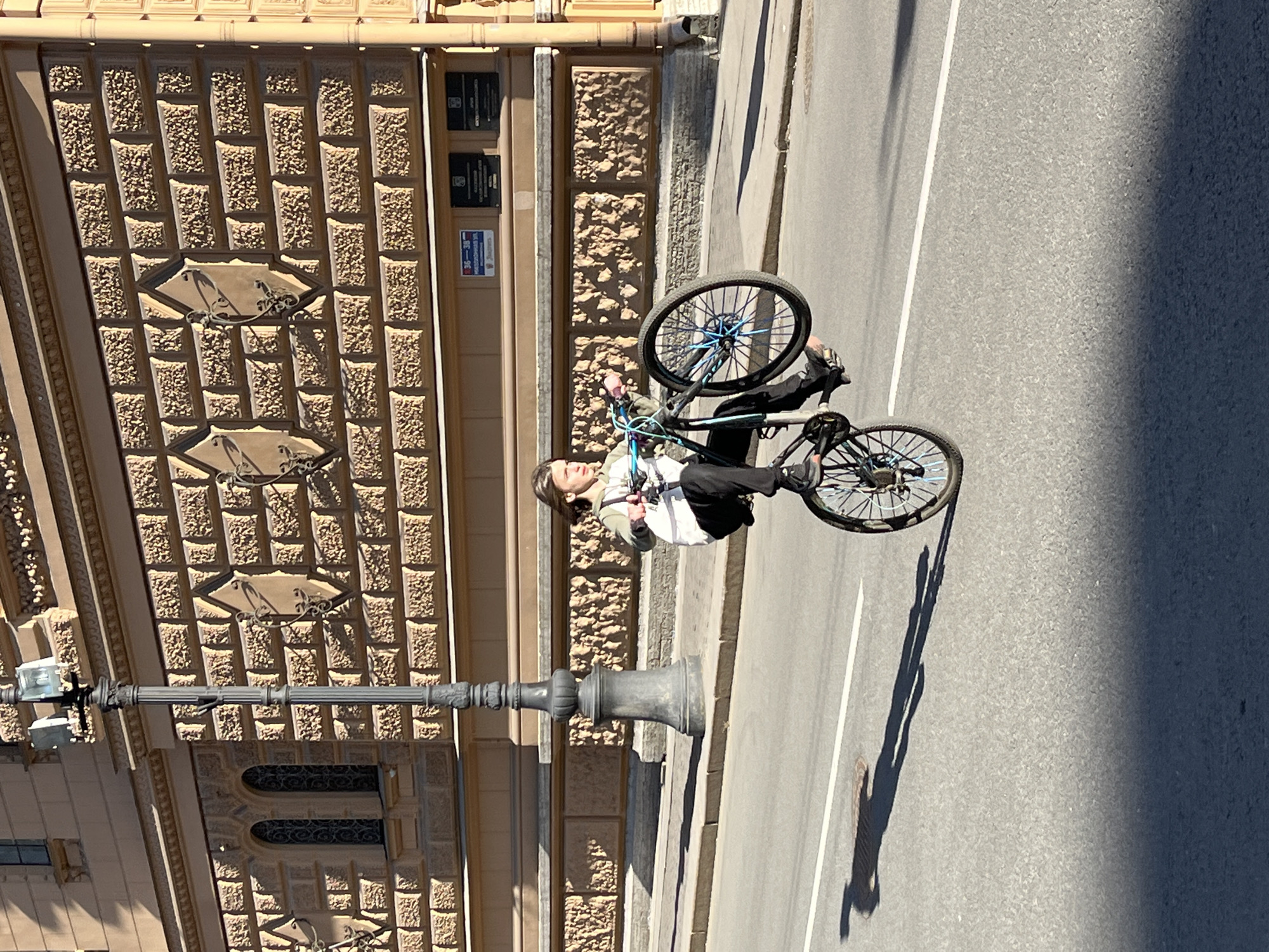 The image captures an individual performing a bicycle wheelie on Millionnaya Street in Saint Petersburg, Russia, under bright daylight