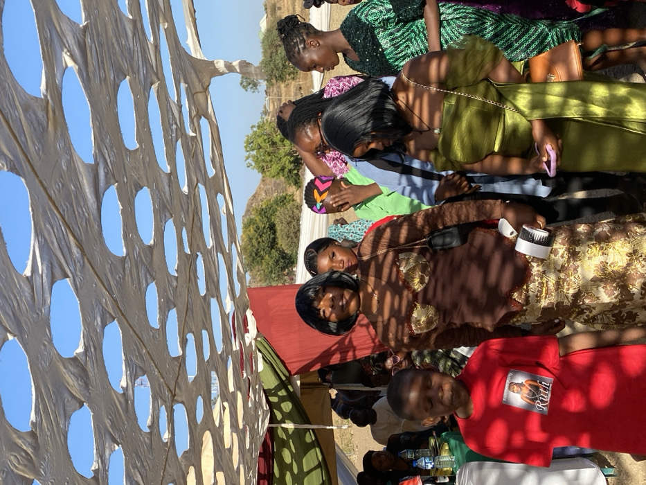 The image depicts an outdoor social gathering in Kuru Dungus, Nigeria, under a temporary shade structure