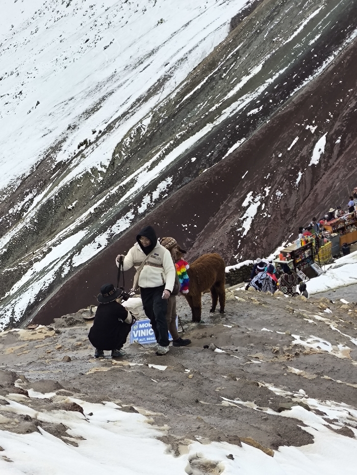 Three people and an alpaca pose for a photograph at Rainbow Mountain in Peru. A photographer in a black hat crouches down to take a picture. A man in a white jacket holds a camera strap, while another man stands beside the alpaca, which wears a colorful lei. A sign near the people reads "MON VINICUCA ALT. 5038". Snow covers parts of the mountain. Souvenir stands are located on a higher path behind them.