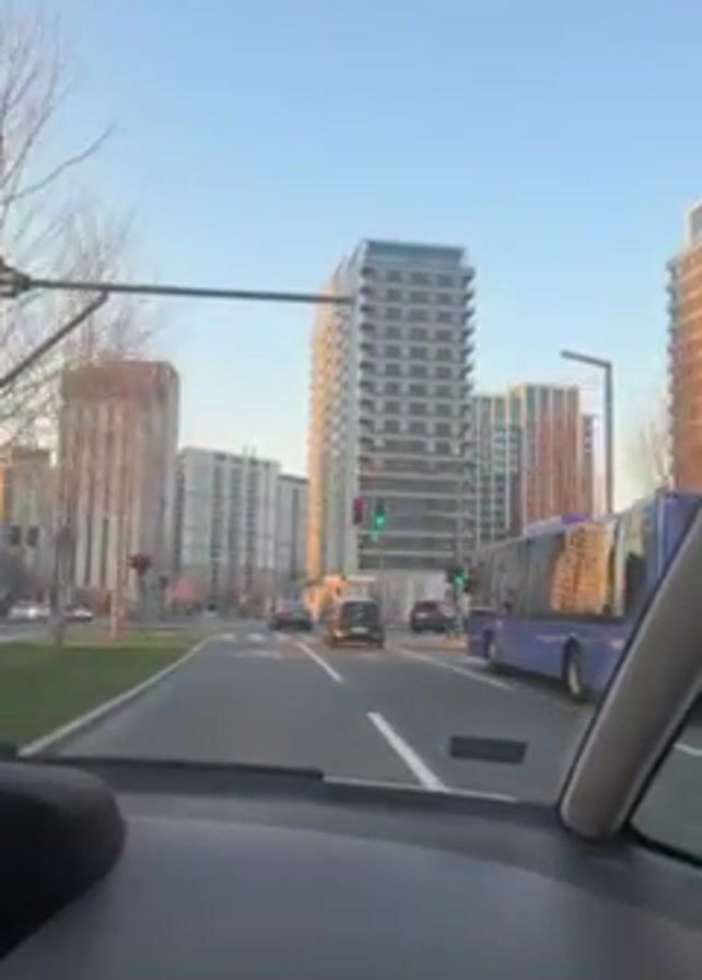 The video, taken from inside a car, shows a city street scene