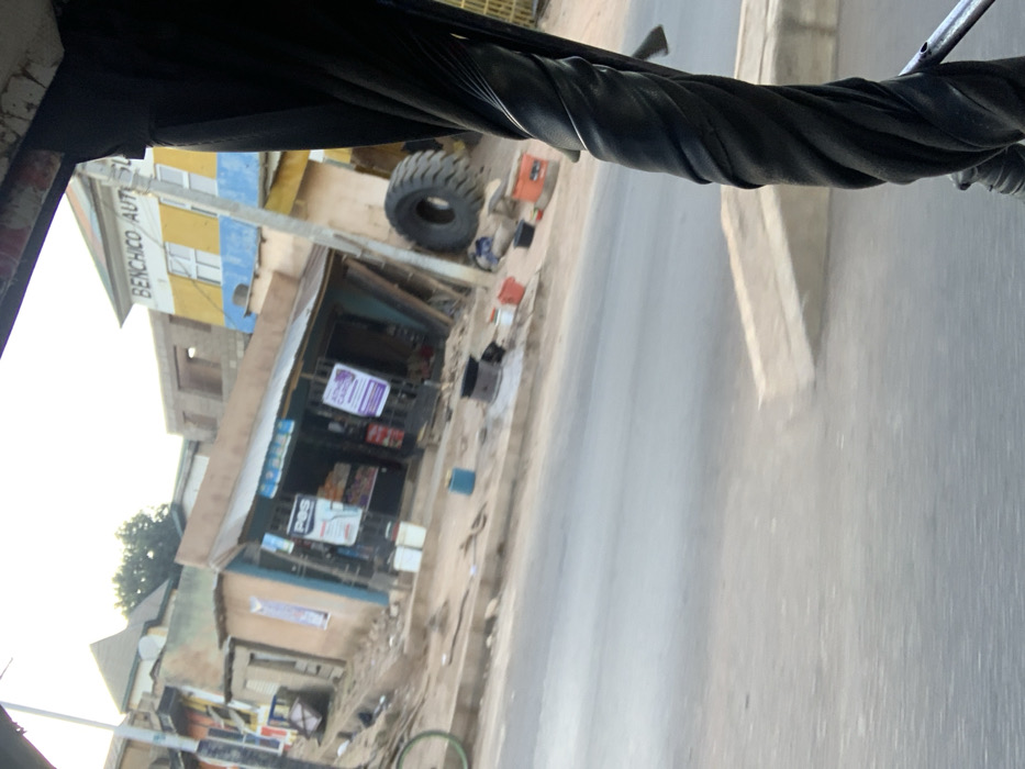 The image displays a street scene in Barakin Lerawi, Nigeria, captured from the interior of a moving vehicle, evidenced by the blurred foreground pavement and a dark, twisted support pillar occupying the right side. The scene focuses on the right side of a paved road, where a raised concrete curb borders an unpaved shoulder. Dominating the background on the right is a multi-story building, partially constructed with exposed brickwork and partially finished with vertical yellow and blue painted stripes. The finished section displays the text "BENCHICO AUTO SUPPLY". A large, black, heavy-duty tire leans against the lower wall of this building. Adjacent to it on the left is a smaller, single-story shop with a corrugated metal roof and a light brown facade. This shop features multiple signs, including one with "POS" (Point of Sale) prominently displayed, and a purple sign advertising "ATM CARD". The ground in front of these structures is unpaved, uneven, and appears to be dirt mixed with debris. Objects scattered on this ground include several white, red, and black plastic containers or buckets. Near the center, a dark, cylindrical metal object, possibly a makeshift stove or burner, is present with visible ash or residue. A green bicycle wheel is partially visible on the far left. The paved road surface in the foreground shows signs of wear. No individuals are clearly visible performing actions in the frame. The ambient lighting suggests daytime conditions.