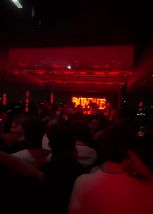 A dimly lit nightclub filled with people is shown. Red neon lights illuminate the room and the word "BONNIE'S" can be seen. The view from the rooftop nightclub shows the city lights in the background. The crowd of people are mostly facing the DJ. The sounds of music and people can be heard in the video.