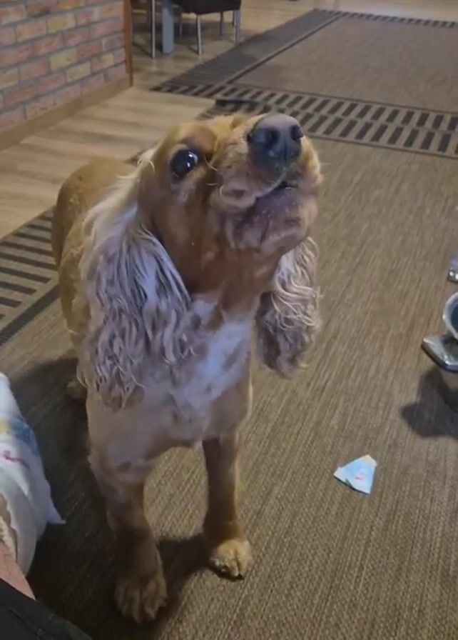 medium-sized, golden-colored Cocker Spaniel standing on a brown patterned carpet. The dog is looking upwards with its mouth open, vocalizing a sound that sounds like a soft howl or whimper. In the background, there is a brick wall, wooden flooring, and a partially visible baby stroller and high chair. There are also a few objects on the floor near the dog, including a piece of paper. Part of a person's legs can be seen on the left side of the frame, suggesting they are likely the one holding the camera.