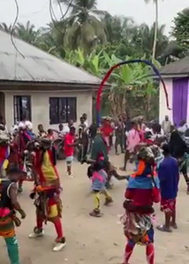 group of people gathered in an outdoor space, seemingly a village or rural area, with houses and palm trees in the background. Several people are wearing colorful, traditional costumes, some with tall headwear and fringed adornments. They are moving and dancing, while a person dressed in black crawls on all fours in the center of the group. There are spectators watching, some taking pictures with their phones. A curved, colorful decoration hangs above the scene. The overall atmosphere appears to be festive and cultural, likely a celebration or performance.
