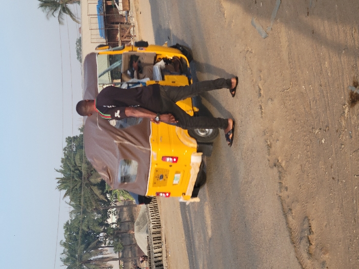 A yellow tuk-tuk sits parked on a paved road next to a person in a dark shirt and pants. The tuk-tuk has a light-brown soft-top covering the passenger area. The person is wearing sandals and a watch, seemingly pausing next to the vehicle. Palm trees are visible in the background, along with other buildings and utility poles. The road surface shows signs of wear and tear.