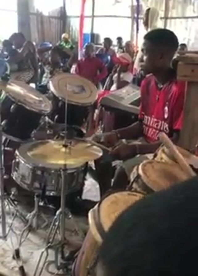 musical performance in an open-air structure. A young man in a red and black soccer jersey is playing a drum set, which includes a snare drum, cymbals, and a few toms. Next to him, another man is playing a set of three conga drums with wooden sticks. The drums are decorated with colorful patterns. Behind them, other people are sitting and standing, observing the performance. A keyboard is visible behind the drummer. The structure has a simple wooden frame and a roof made of corrugated metal or similar material. There is a small wooden table with a bag on top that says "CONGRATULATIONS AREWEN". Overall, the scene depicts a lively musical gathering, possibly at an event or celebration.