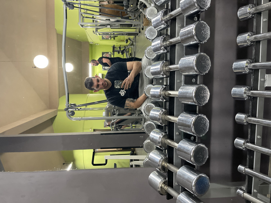 The image captures the reflection of an indoor fitness center in Sofia, Bulgaria. In the foreground, a two-tiered rack holds an array of chrome-plated dumbbells of various sizes. Reflected in the large mirror behind the dumbbell rack is a male individual, appearing to be in his late 20s or early 30s, seated, holding a smartphone in his left hand, seemingly taking a selfie or video. He has short dark hair, a light complexion, and visible tattoos on his right arm. He is dressed in a black t-shirt with a white graphic and light grey sweatpants. The gym's interior, visible in the reflection, features lime green walls and a light tan ceiling with a single spherical white light fixture. In the reflective background, another bald male figure wearing a black t-shirt is visible, standing with his back partially to the camera, near other gym equipment. Various weight machines and racks are scattered throughout the reflected space.