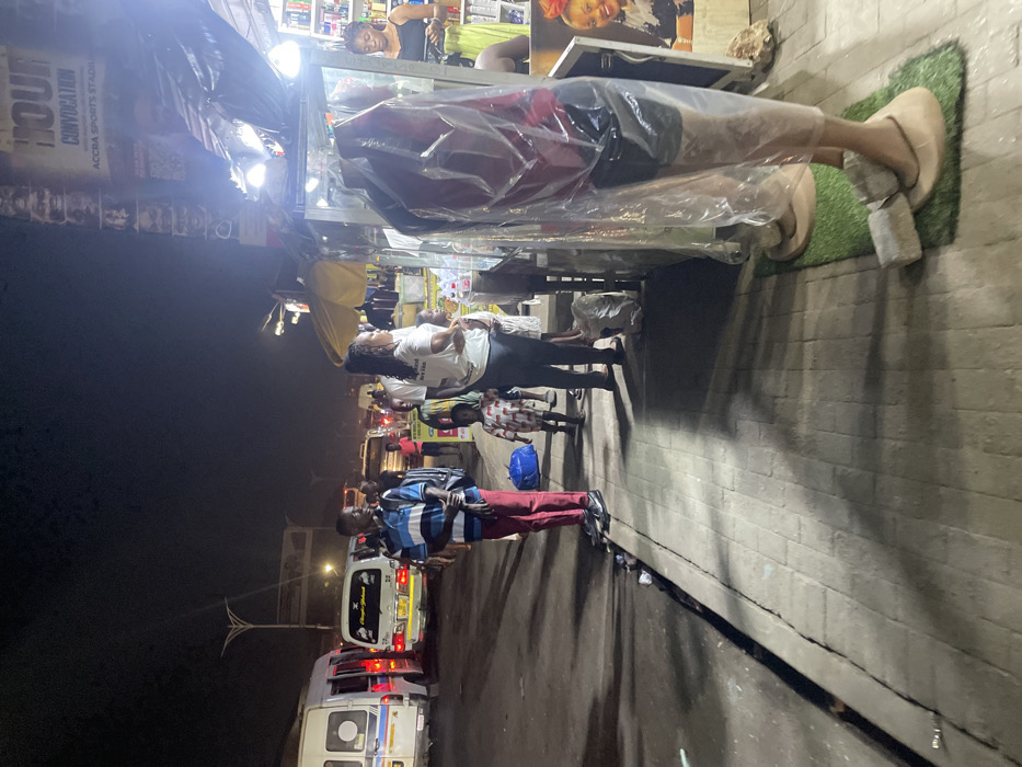 A street scene at night shows pedestrians along a sidewalk near a street with several vehicles. A vendor's stall is visible with people seemingly shopping. The stall is draped with clear plastic sheeting. Above, posters or advertisements line the storefront. A man in slippers stands on a small patch of artificial turf next to the stall. The overall impression is a lively, bustling urban atmosphere.