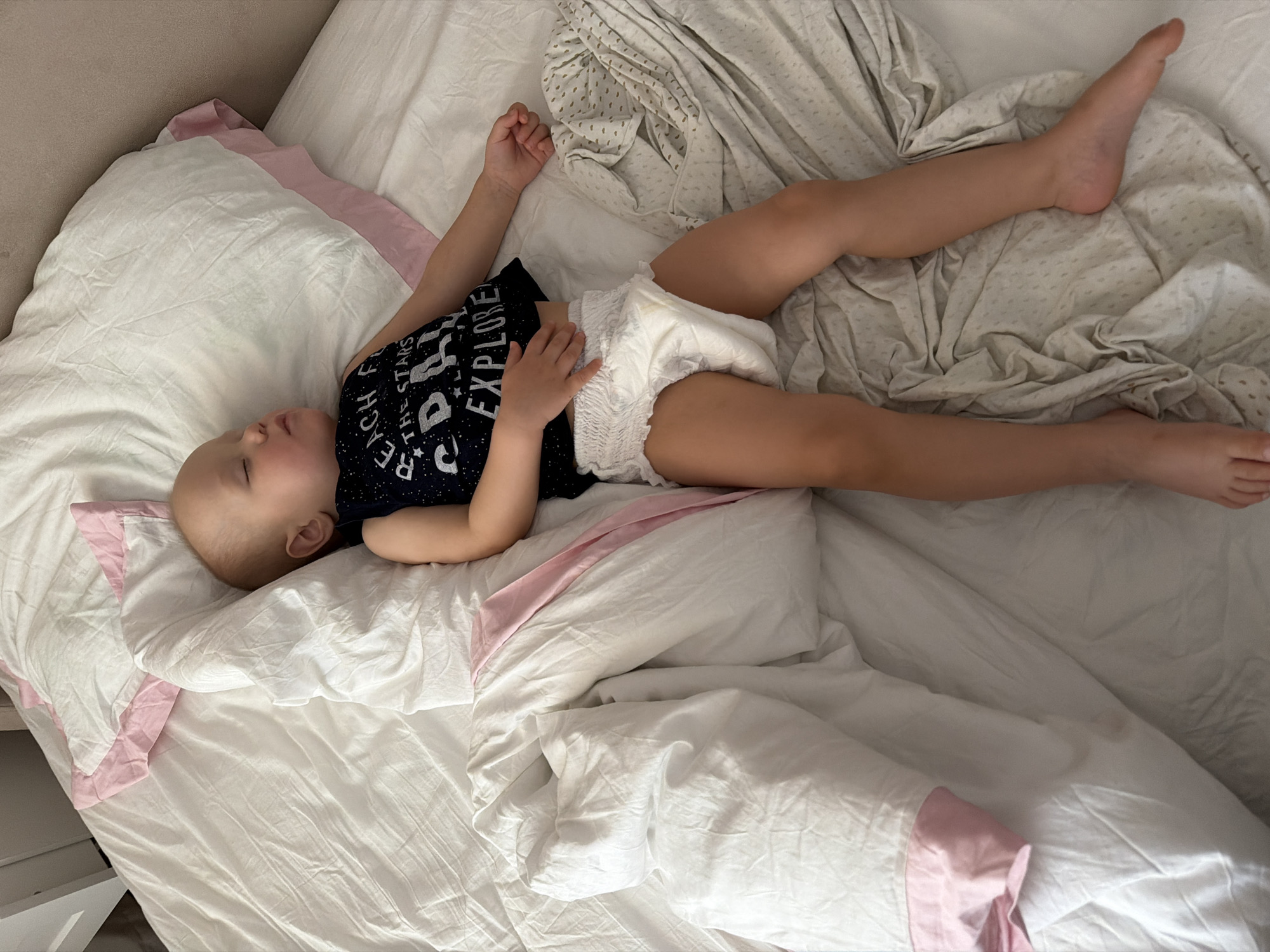 A child lies asleep in a bed, likely indoors, in Chaikovsky, Russia. The child, wearing a dark shirt with light-colored writing and a disposable diaper, is positioned diagonally across the bed. The bed is covered with wrinkled white sheets and has a white pillow with a pink border. One arm of the child is raised above their head, and the other rests on their abdomen. The child's legs are extended. A light-colored blanket is partially visible at the top of the image.