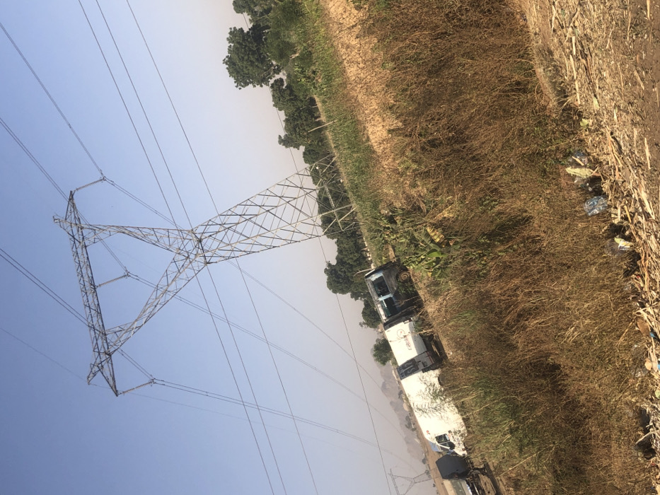 The image displays an outdoor, rural or semi-rural landscape in Hanwa, Nigeria, under a hazy blue sky. A large, grey steel lattice high-voltage electricity transmission tower dominates the midground, extending upwards from the center-right. Multiple power lines emanate from its insulators, traversing the sky diagonally. Below the main tower and towards the left, two stationary vehicles are positioned on what appears to be an unpaved track. The foremost vehicle is a white cargo van with "FREIGHT" lettering and a logo visible on its side. Directly behind it, a dark-colored minivan or bus, appearing older or damaged, is partially visible. The immediate foreground consists of dry, brown grasses and weeds, interspersed with discarded plastic bottles and other debris. Beyond this, a patch of greener, cultivated crops (possibly maize or similar) is visible, leading to a line of green trees in the background. In the far distance to the left, another smaller transmission tower is faintly visible, along with distant undulating hills or mountains. No individuals are present in the scene.