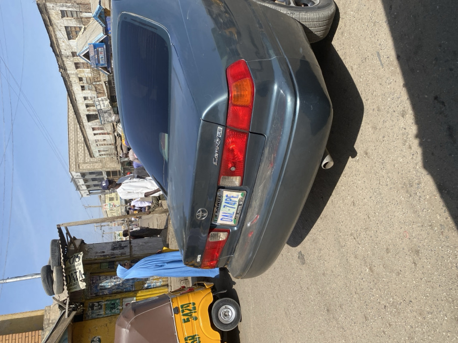 This image depicts a daytime street scene in Kaura Goje, Nigeria. In the immediate foreground, the rear of a dark teal Toyota Camry LE sedan with tinted windows is prominently featured, displaying a Nigerian license plate "KANO DAL-74PE". Its exhaust pipe is visible beneath the bumper. To the left of the sedan, the rear-left portion of a yellow three-wheeled auto-rickshaw (Keke Napep) is partially visible, bearing the number "5429" on its side. Further into the scene, a person clad in a light blue full-body garment stands near a makeshift street stall constructed from corrugated metal sheets and wood, with several old tires stacked on its roof. Various posters and papers are affixed to the stall's exterior. To the right of this person, a man wearing a white long-sleeved tunic and a dark cap stands in the street, facing right. Numerous other pedestrians are present further down the street, some less distinct due to distance. The background reveals a street lined with buildings of varying age and construction, some appearing weathered with exposed concrete and multiple windows. Overhead utility lines crisscross against a clear, bright blue sky, indicating strong sunlight casting shadows on the asphalt road surface. The overall environment suggests a bustling urban or semi-urban area.