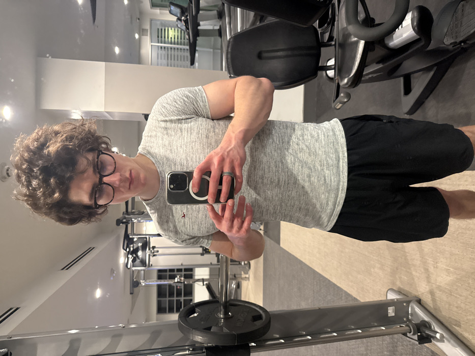 A male individual is depicted taking a mirror selfie inside a fitness center in Los Angeles, United States of America. He possesses brown, curly hair and wears dark-framed eyeglasses, a heather grey short-sleeved t-shirt with a small red Hollister seagull logo, and black athletic shorts. A dark grey silicone ring is visible on his left ring finger. He holds a dark-colored smartphone, featuring a visible MagSafe ring, in both hands at chest level, looking down. The background shows various gym equipment, including a cable machine or Smith machine with weight plates on the left, a black recumbent bicycle on the right, and multiple treadmills in the distant background. The floor is covered with grey carpet and lighter-toned sections. Artificial lighting illuminates the scene.