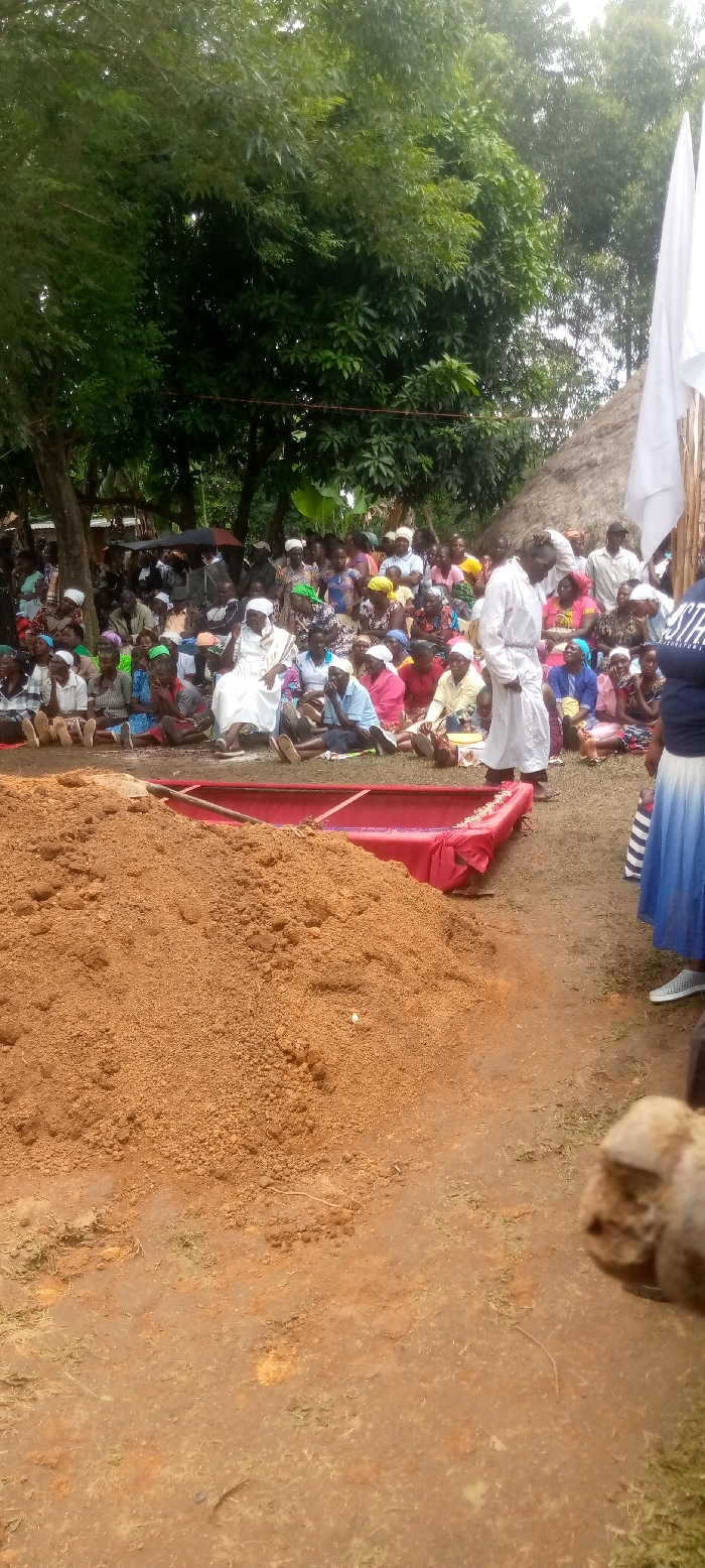 A large pile of loose red dirt lies in the center foreground of the image. In the background, a large group of people, mostly women, are seated on the ground. A man wearing a white robe is standing in front of the group, with his arms crossed in front of him. To the man's right, a woman is wearing a blue and white dress. The people are seated in front of a wooden structure partially covered in thatch. Trees are visible in the background. The scene is located at coordinates 0.46 latitude, 34.776 longitude, which places it in the city of Burundu, Kenya.