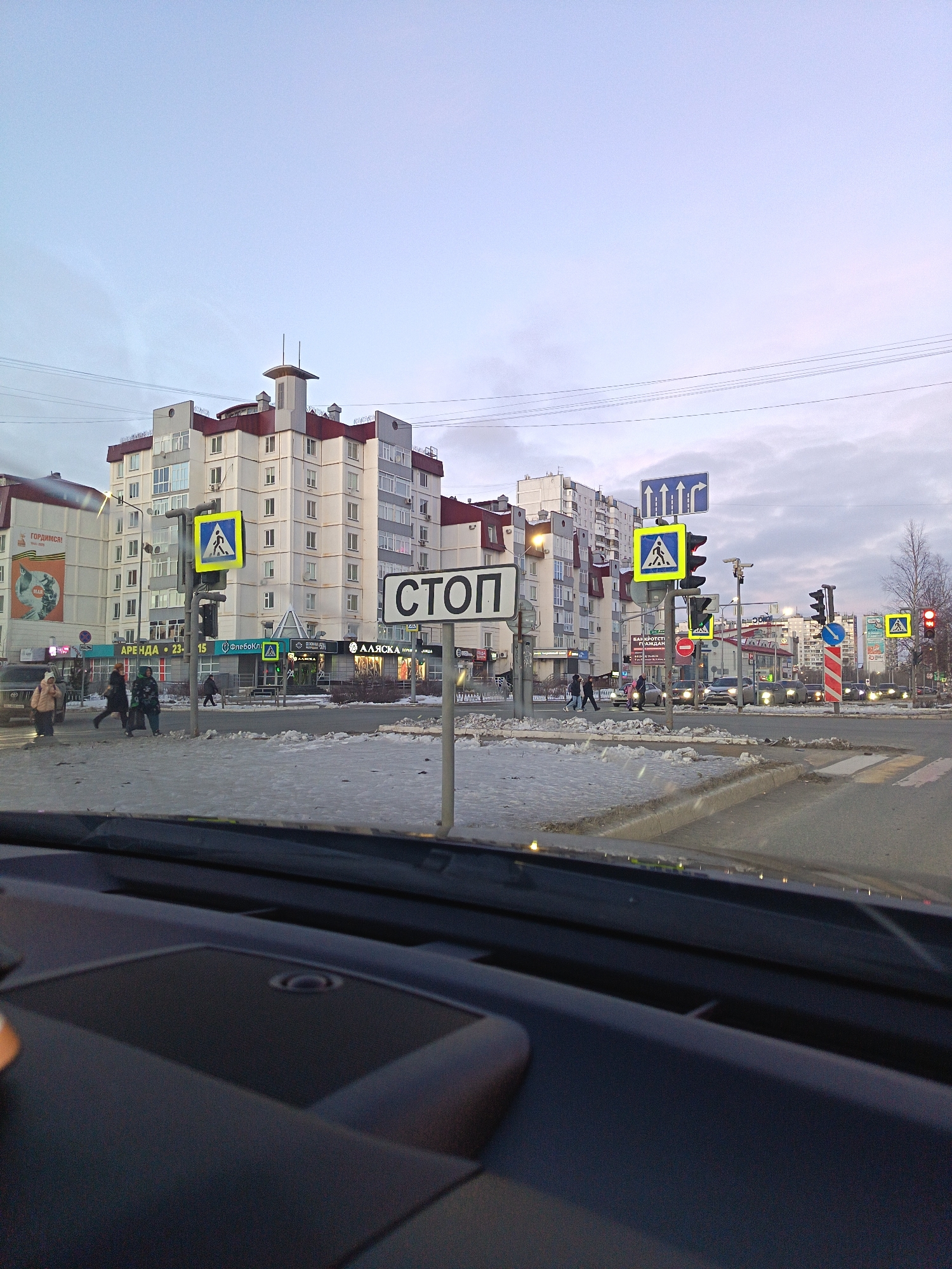 The image depicts a street scene in Nizhnevartovsk, Russia, viewed from inside a vehicle. A "STOP" sign is prominently displayed at the intersection. Pedestrian crossings are visible with yellow pedestrian crossing signs overhead. A group of people are crossing the street. Buildings are in the background. Traffic lights are visible, with some showing red. Patches of snow are on the ground. The car's dashboard is in the foreground. There is a sign that says "ARENDA" along with two people walking.