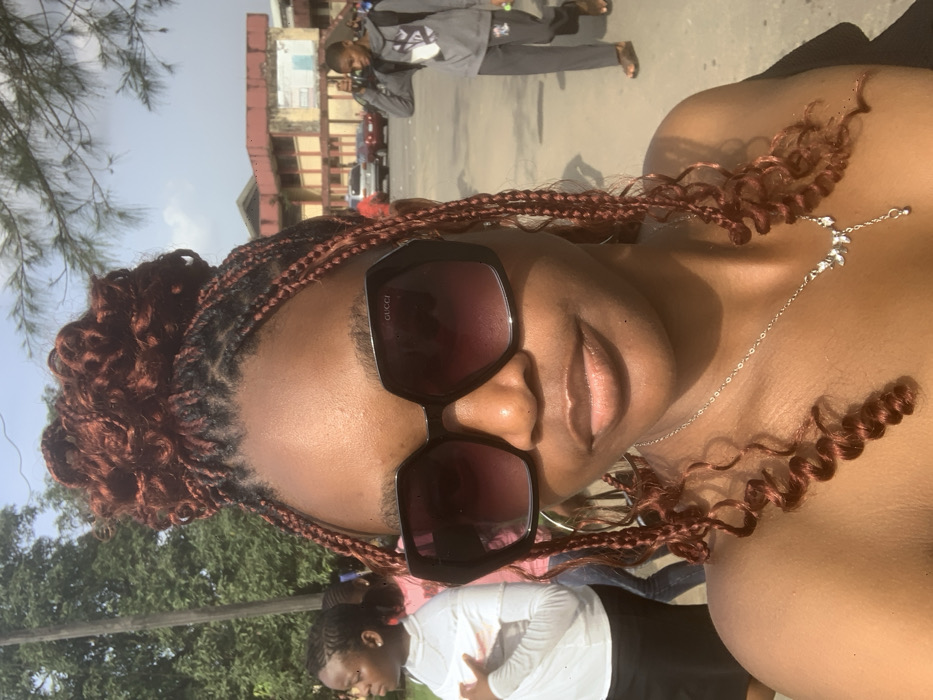 A person is shown close-up, wearing large, dark sunglasses and a necklace with crystal accents. The hair is styled in red-brown braids, some of which frame the face. The setting appears to be outdoors during the daytime, with sunlight illuminating the subject. In the background, indistinct people and buildings are visible, suggesting a public space. The photo is taken at an angle, slightly tilted from a straight-on view.