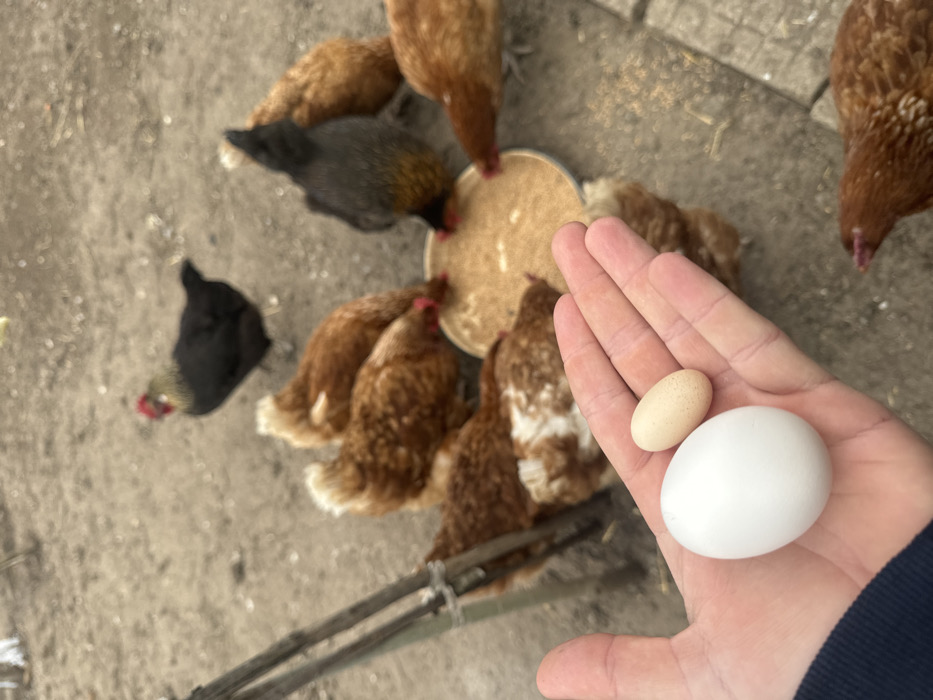 This image depicts an outdoor scene in Dolna Dikanya, Bulgaria. In the foreground, a human hand, identifiable by light skin tone and a visible dark blue sleeve on the left wrist, holds two chicken eggs. The egg on the left is large, smooth, white, and oval-shaped. The egg on the right is significantly smaller, elongated, light tan in color, and exhibits subtle speckling. In the mid-ground, a circular metal feeding dish, approximately 30-40 cm in diameter, contains a quantity of light brown granular feed. Approximately eight domestic chickens are actively gathered around and pecking at the feed in this dish. These chickens primarily display reddish-brown plumage, with one notably dark grey chicken and another reddish-brown chicken featuring distinct white markings. Further in the background, a black rooster with a prominent red comb is observed walking on the dirt ground, moving away from the feeding group. The immediate environment consists of exposed light brown dirt, indicating a rural or farmyard setting. A rudimentary wooden structure, composed of two vertical poles secured by a horizontal tie, is partially visible on the far left of the frame.