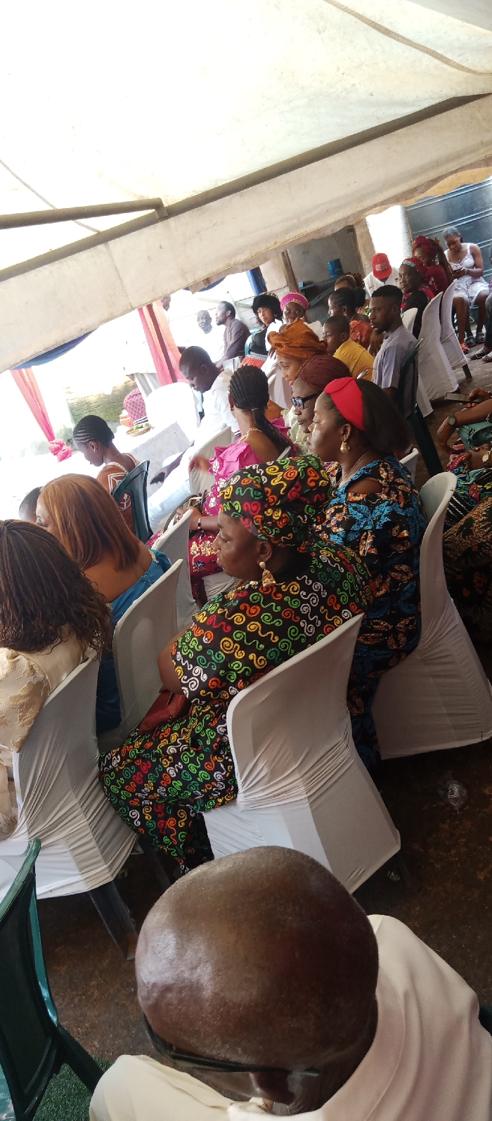 The image depicts a crowded gathering under a white canopy in Udi, Nigeria. The perspective is from behind a bald man's head in the extreme foreground, looking towards rows of seated individuals. Attendees, predominantly adults, occupy white plastic chairs covered with white fabric, arranged in an event setup. In the mid-ground, a woman wearing a black dress with vibrant multi-colored swirl patterns and a matching headwrap sits on the right, adorned with large, golden, triangular earrings. Next to her, a woman in a blue patterned top and a woman with brown hair are visible. Further back, a woman with braided hair wears a pink top. Various other individuals, both men and women, are seated in the background, dressed in a mix of traditional and casual attire, including patterned fabrics, shirts, and headwraps. One woman in the far background on the right is seen looking at a mobile phone. The environment suggests an outdoor or semi-outdoor event, with a white tent structure supported by metal beams providing overhead cover. Red and blue drapery is visible in the background, hinting at decorative elements. The ground beneath the chairs appears to be a dark, earthy surface. A partial view of a building structure is discernable beyond the tent in the upper right background.