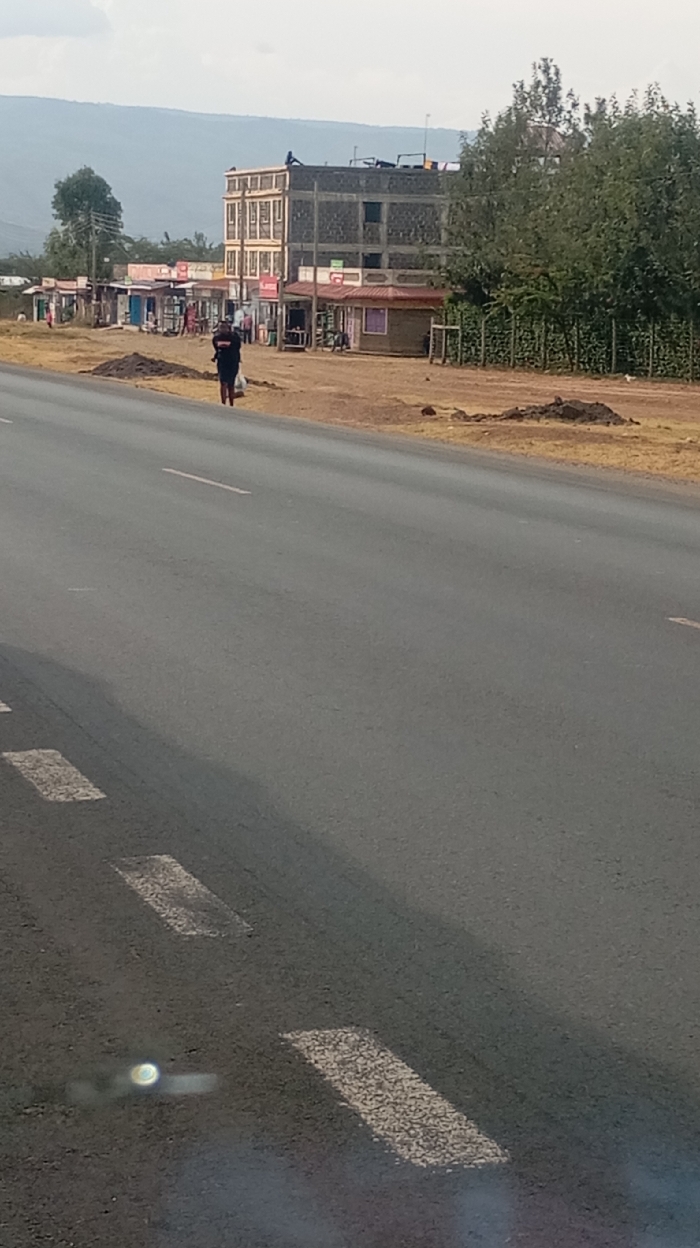 A paved road with dashed white lines stretches into the distance. On the right side, a person walks along the roadside near a cluster of small businesses and a larger, multi-story building. Trees and other vegetation are present in the background. Mountains are seen in the distance with a muted sky above.