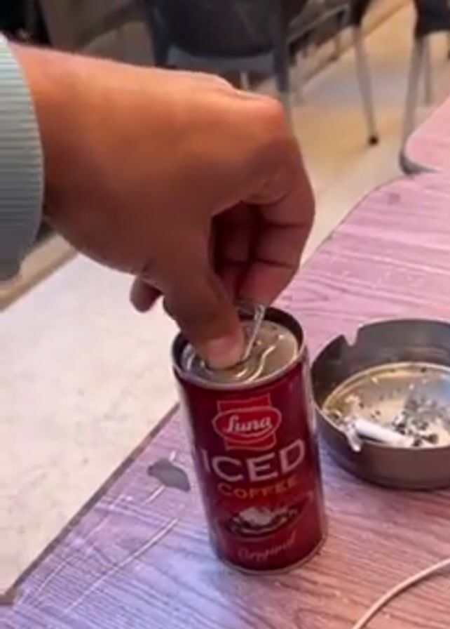 A person's hand opens a can of Luna Iced Coffee on a table. Next to the can is an ashtray with cigarette butts. The table is a light purple and white faux wood laminate. Chairs are visible in the background.
