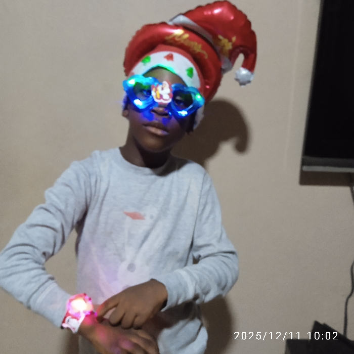 An interior scene captured in Agege, Nigeria, depicts a young, dark-skinned individual posing in front of a light beige wall. The individual is centered in the frame, wearing a red inflatable Santa hat over a traditional fabric Santa hat, and blue glowing heart-shaped glasses. They are dressed in a long-sleeved light grey shirt with a faded graphic on the chest. A multi-colored glowing wristband is visible on the left wrist, towards which the individual's right index finger is pointed. To the right of the individual, a portion of a dark television screen is visible, along with associated electronic equipment. The image includes a timestamp in the bottom right corner: "2025/12/11 10:02".