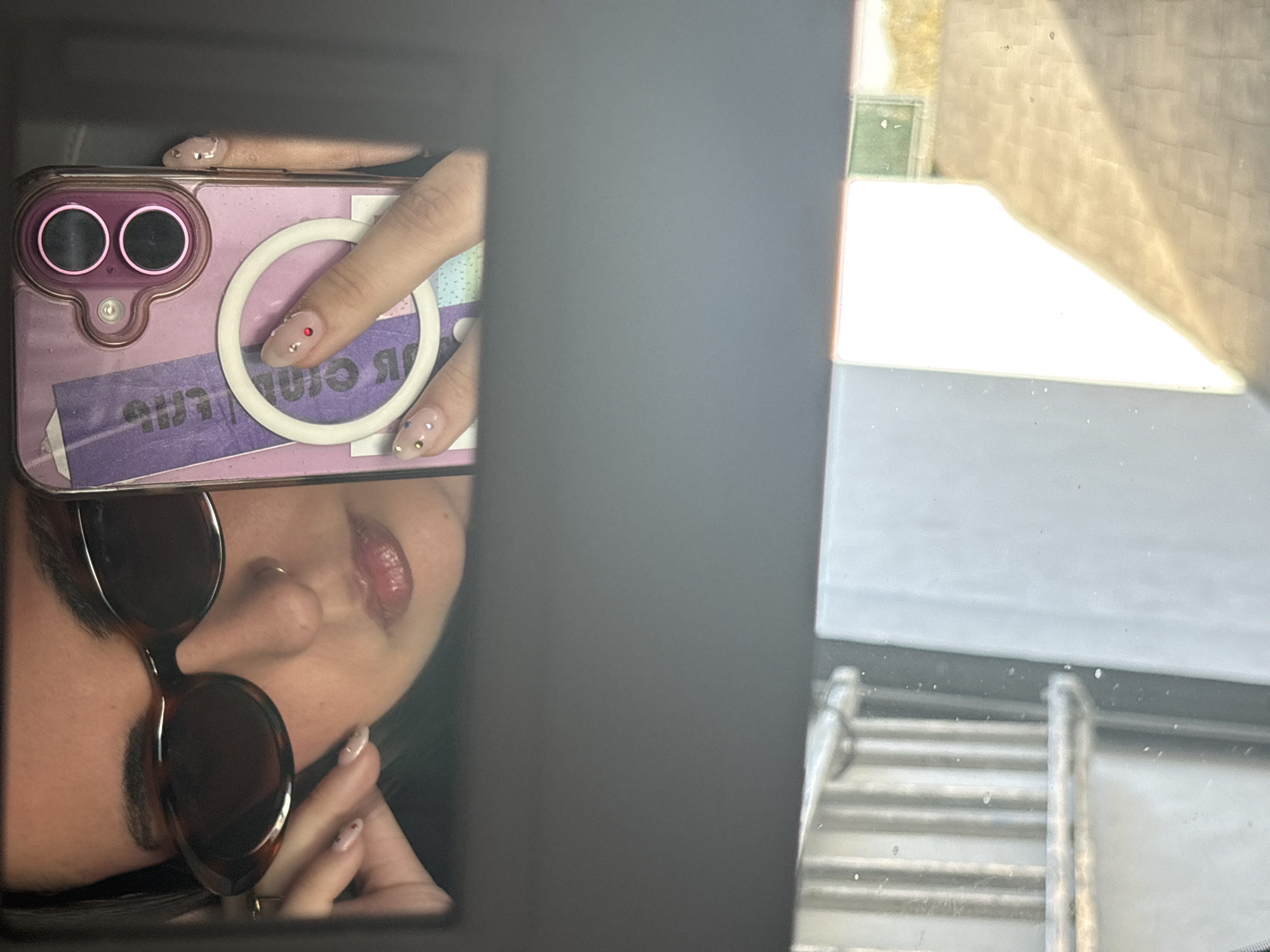 The image displays a mirror reflection of a female individual taking a selfie with a smartphone, situated in Urbanización Encinares De Alcolea, Spain. **Scene Description:** The upper two-thirds of the image show the reflection of a person from the shoulders up. The individual has dark hair and is wearing dark, oval-shaped sunglasses with tortoise-shell frames, obscuring the eyes. A small gold stud is visible in the left nostril (viewer's right). The lips are parted slightly and appear to have a glossy application. The person's left hand (viewer's right) holds a smartphone vertically. This hand's fingernails are manicured with a clear or light base coat, adorned with small decorative elements including a red rhinestone on the ring finger and gold-toned dots on the pinky and index fingers. The smartphone has a transparent or translucent pink/purple case, through which several overlapping paper or sticker elements are visible, primarily purple in tone. A large white circular object, possibly a pop socket or grip, is affixed to the phone case. The phone's dual camera module with two black lenses outlined in pink is visible in the upper right quadrant of the phone's reflection. The person's right hand (viewer's left) is partially visible, with manicured nails also featuring small decorative elements. The lower third of the image shows a reflection of an exterior environment. This includes a blurred, light-colored building facade or structure on the left, possibly with vertical elements like railings or louvers. To the right, a ground surface, possibly paved with light-colored tiles, is visible, illuminated by sunlight casting a diagonal shadow. A small patch of green, possibly vegetation, is discernible in the upper right corner of this lower reflection. The overall lighting suggests daylight.