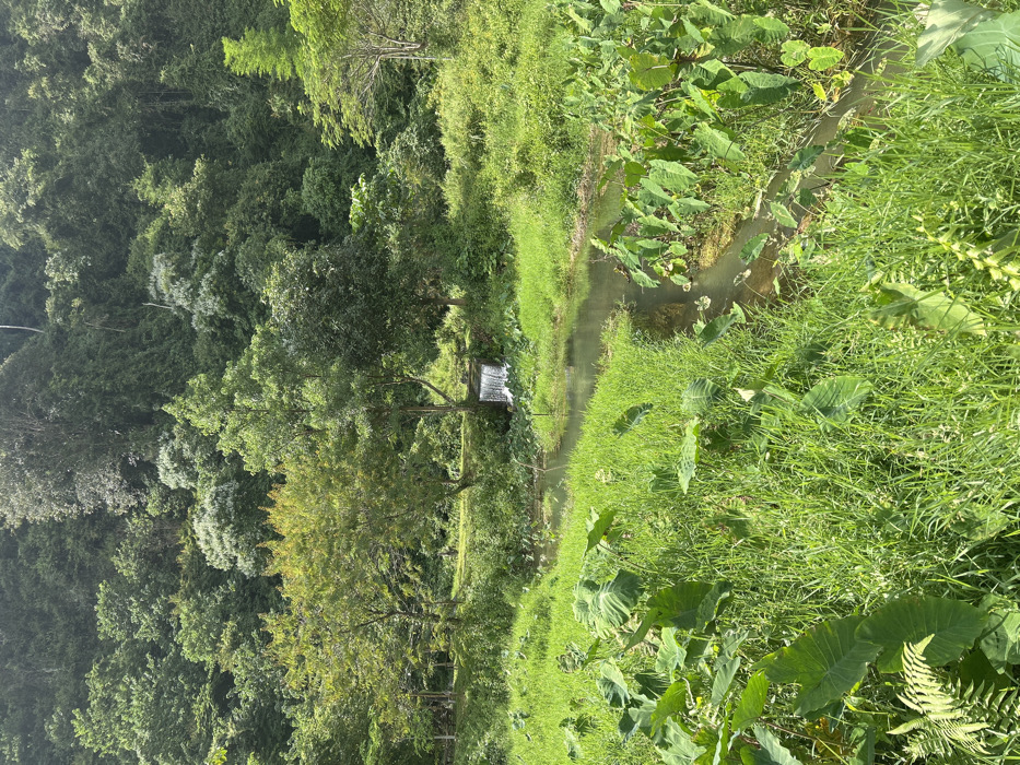 Lush greenery blankets the scene, featuring a variety of plant life from ferns and tall grasses to large-leaved plants resembling taro. A narrow stream meanders through the landscape, with a small waterfall visible in the distance. Dense trees line the opposite bank, creating a verdant forest backdrop. The overall impression is one of natural beauty and tranquility.