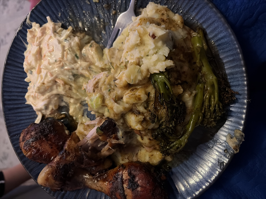 A dark blue plate holds a meal. On the left, there's coleslaw, creamy and mixed with shredded carrots. Adjacent to it are mashed potatoes, seemingly flavored with herbs and possibly gravy. Next to the mashed potatoes, are two charred pieces of what appears to be grilled broccolini. The lower left has two dark, grilled chicken drumsticks. A fork rests atop the coleslaw and mashed potatoes.