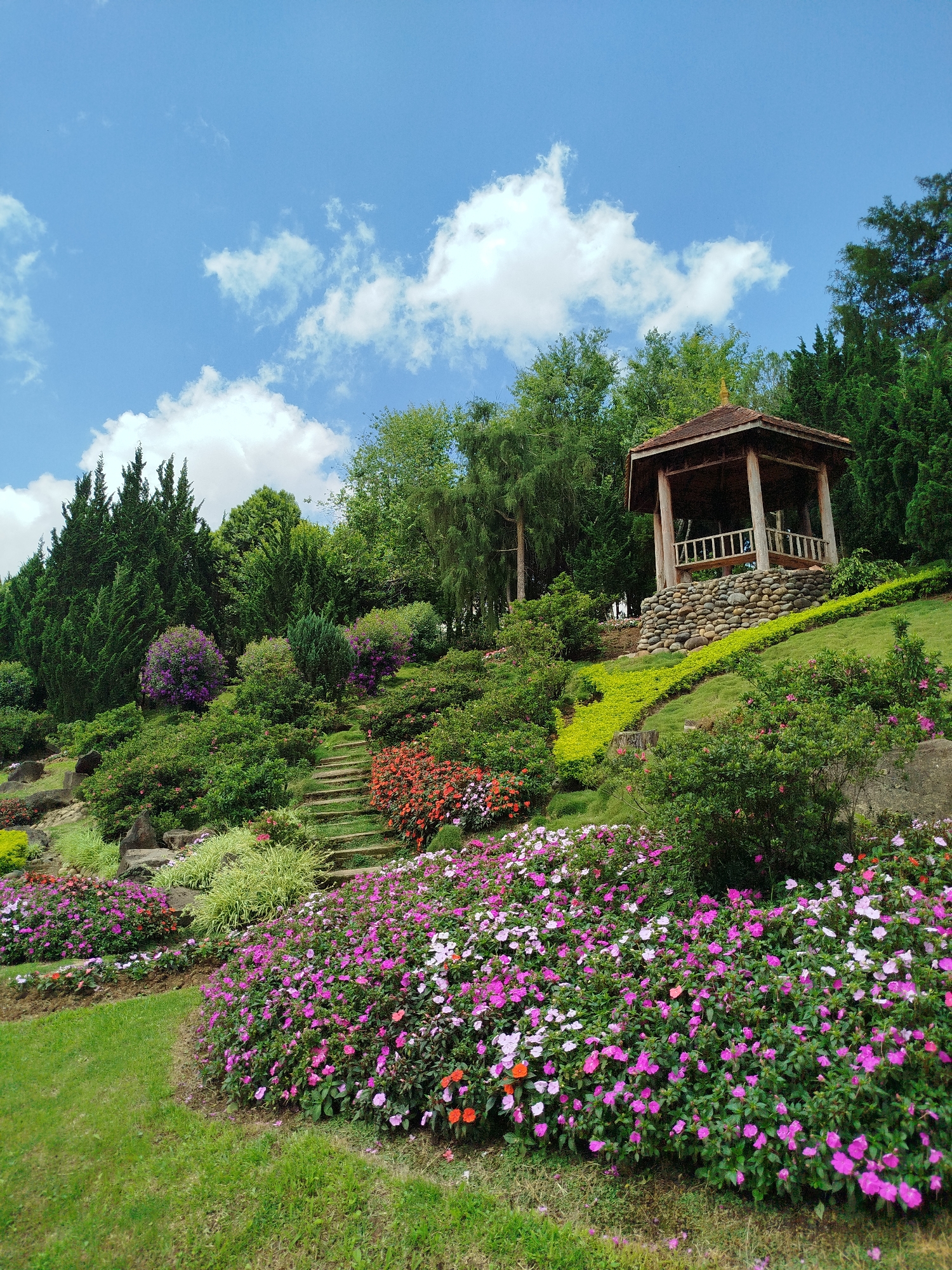 scenic garden landscape, possibly located in Lam Vien - Da Lat, Vietnam. A wooden gazebo stands atop a stone base on a grassy slope, surrounded by lush greenery. A terraced garden descends towards the foreground, featuring vibrant flower beds with pink, white, and orange blooms. Trees and shrubs are interspersed throughout the landscape, creating a layered effect. A stone staircase ascends through the foliage. The sky is blue with scattered white clouds.