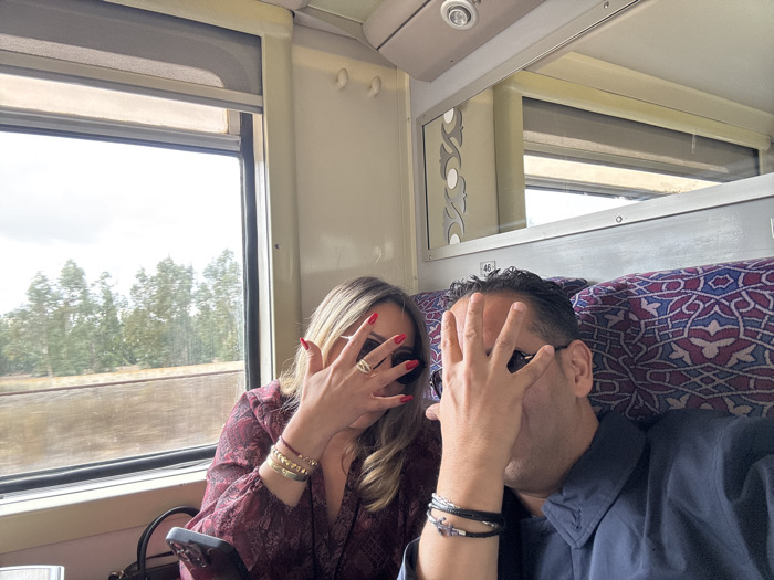 The image depicts two individuals inside a train carriage, reportedly in the city of Sidi Yahya El Gharb, Morocco. A female with light-colored hair and a dark red patterned garment is on the left, her right hand with red nail polish, gold bracelets, and a gold ring raised to obscure her face. She wears dark sunglasses. A black smartphone is visible near her left. A male with dark hair and a dark blue collared shirt is on the right, his left hand with black bracelets and a silver anchor charm raised to obscure his face. He wears dark sunglasses. Both individuals are looking towards the camera, intentionally covering their faces. The train interior features upholstered seats with a purple, blue, and white geometric pattern. A partial seat number "46" is visible on a headrest. Light-colored wall panels and a ceiling light fixture are visible. Above the male, a decorative silver-toned panel with a patterned cut-out design is mounted. A large rectangular window on the left side displays an exterior scene composed of numerous green trees under an overcast sky, with a blurry light brown area below the tree line.