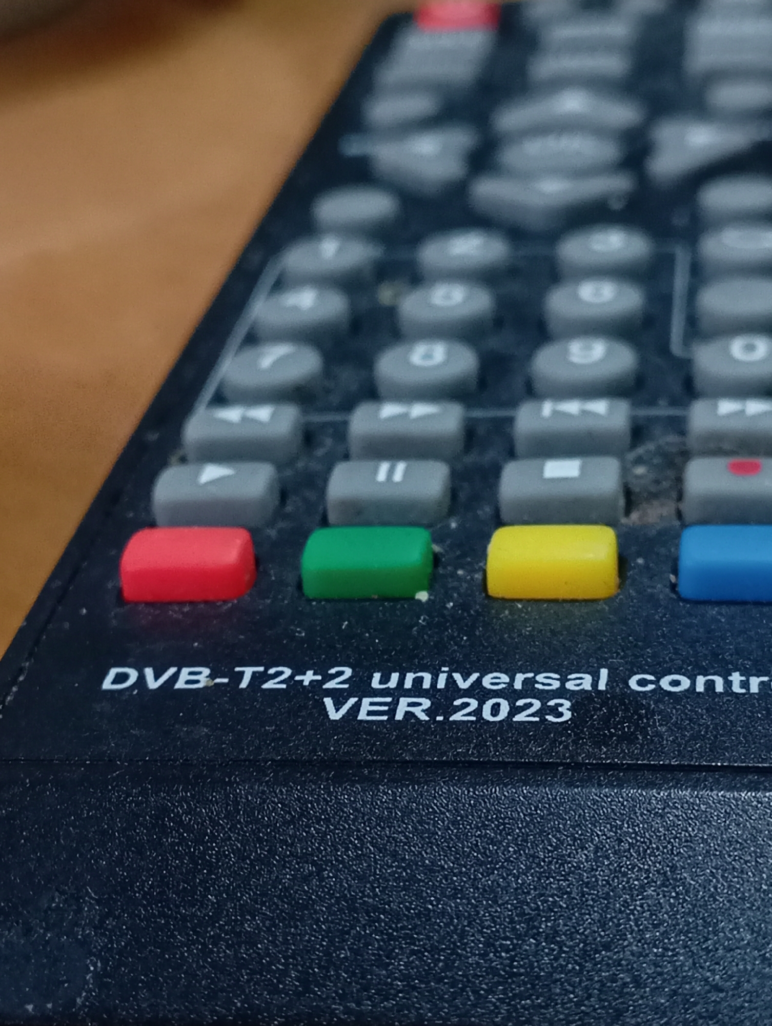 The image displays a close-up, angled view of the upper portion of a black, textured universal remote control, specifically identified by white text as "DVB-T2+2 universal contr" and "VER.2023". The remote is positioned on a smooth, light brown surface, possibly wood. The upper-right section of the remote and its buttons are out of focus, while the lower-left section, including the text and a row of four distinctively colored rectangular buttons (red, green, yellow, blue from left to right), is in sharper focus. Above these colored buttons, several rows of gray, oval-shaped buttons with white symbols (e.g., play, pause, fast-forward, rewind, numeric keys 0-9) are visible, appearing covered in a fine layer of dust or debris. No people, specific actions, or interactions are depicted. The exact location within Kurganinsk, Russia, cannot be determined from the visual information provided.
