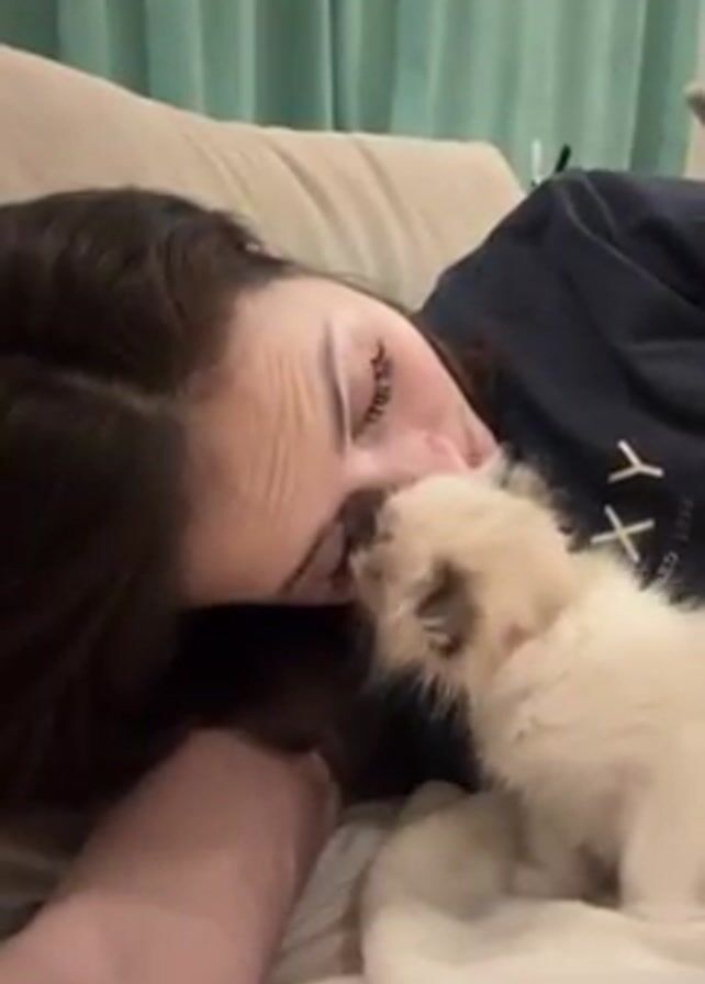 A woman is lying on her side on a light-colored cushioned surface or couch. She has brown hair and is wearing a dark-colored shirt with white lettering. A small, fluffy, light-colored kitten is standing next to her face and appears to be licking her nose. The backdrop includes a light green curtain.