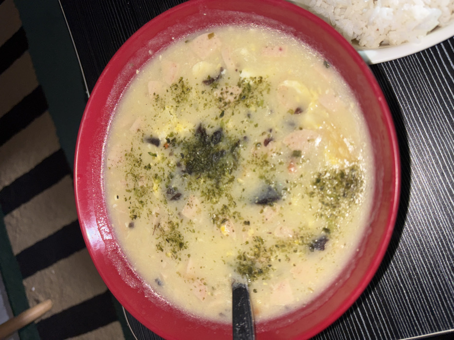 - "A red bowl filled with a creamy soup topped with green garnish, likely seaweed, sits on a black and white patterned table" by FM-AfOay2, licensed under CC BY 4.0