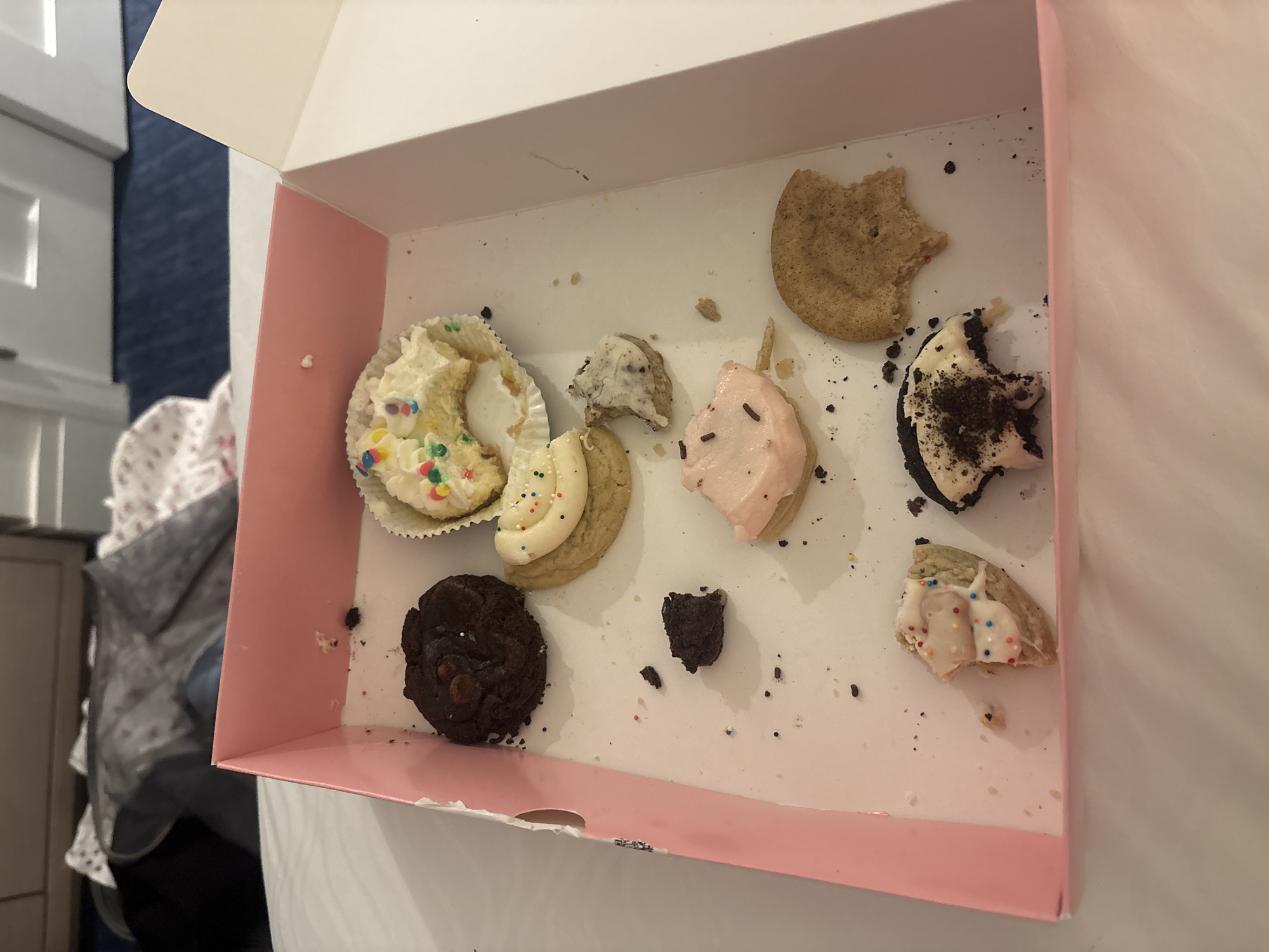 A partially eaten box of cookies sits in a pink and white cardboard box. The box contains an assortment of cookies, some whole and some partially consumed, including cookies with frosting and sprinkles, a chocolate cookie, and a cookie with Oreo crumbs on top. The background shows a blurred room interior with furniture. There is no indication that this image was taken in Miami Beach, or any other specific location. There is no evidence to suggest this image is related to any forensic activity.