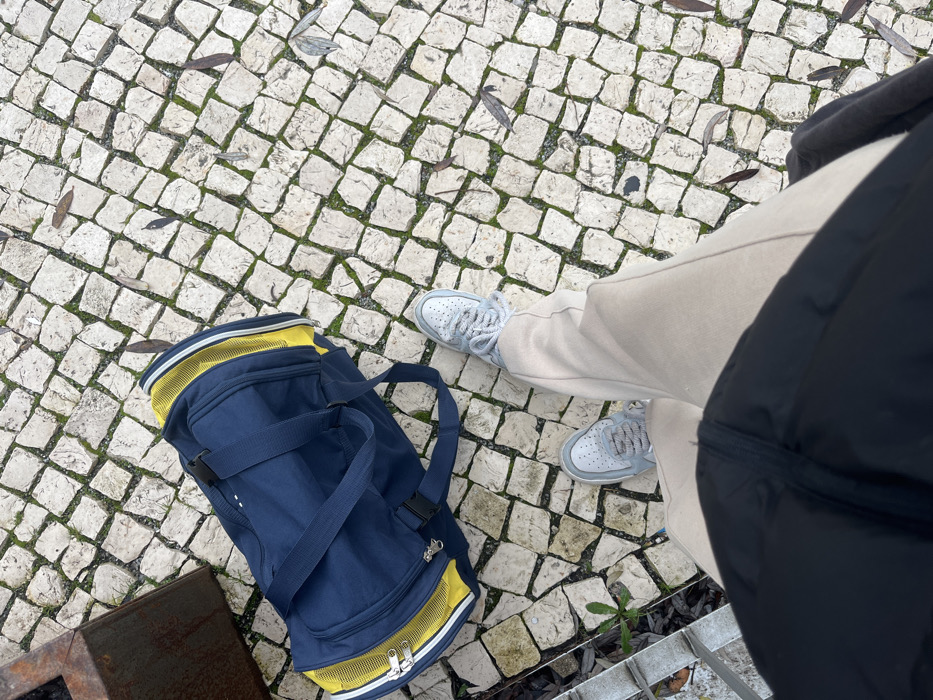 A navy blue and yellow duffel bag sits on cobblestones next to a rusty metal object. The cobblestones are interspersed with fallen leaves and small patches of greenery. A person wearing light tan pants and light blue sneakers stands beside the bag. Part of a black puffy jacket is visible in the foreground. The scene is shot from a high angle, giving a clear view of the ground and the objects placed upon it.