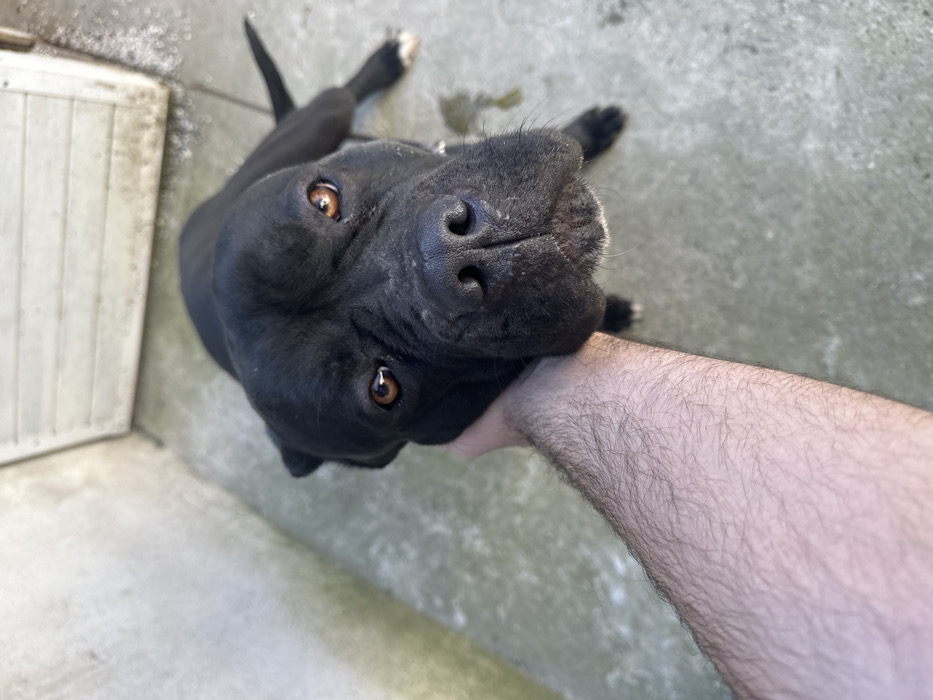 - "In Beloslav, Bulgaria, a large, short-haired black dog with amber-brown eyes, a broad snout, and facial wrinkles is depicted on a light grey concrete surface" by FM-CmCO62, licensed under CC BY 4.0