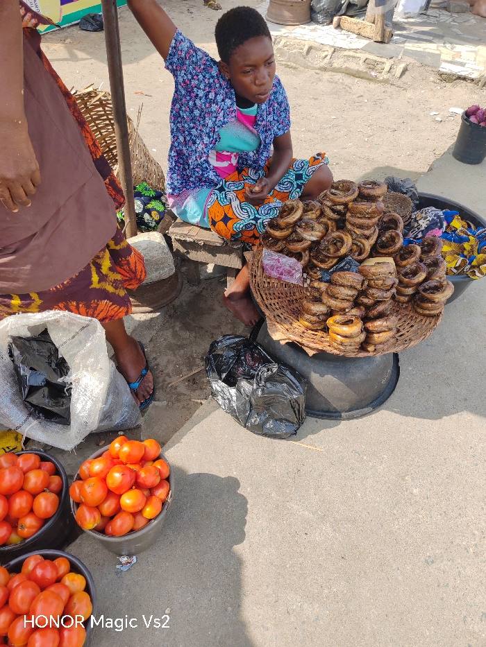 This image depicts an outdoor market scene in Satellite Town, Nigeria, on what appears to be a sunny day