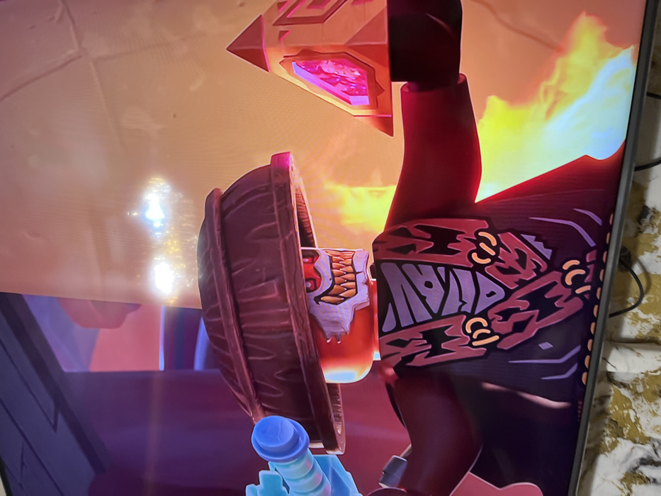The image is a photograph of a digital display, likely a television screen, showcasing a scene from a video game. No discernible geographical features of Caen, France, are present within the displayed content. The central subject is a stylized LEGO-type character, depicted from the chest up, against a vibrant, fiery background. The character wears a dark reddish-brown, ribbed conical hat. Its face is a white skull-like structure with prominent yellow, jagged teeth forming a wide grin, intense red eyes, and red markings on the cheeks. The body is clad in a dark red or maroon robe with a decorative black, purple, and reddish-black patterned tunic featuring small orange, hook-shaped designs on the chest. The character's right hand (viewer's left) holds a light blue, cylindrical object, possibly a weapon or staff, with a lighter blue tip. The character's left hand (viewer's right) grasps a golden, pyramid-shaped object containing glowing magenta elements within its facets. The background behind the character is dominated by bright orange and yellow hues, resembling large flames or an inferno. To the far left, a darker, blurred purple and reddish structure is faintly visible, suggesting an enclosed environment within the game's setting. The image includes reflections of ambient light sources on the screen's surface, particularly in the upper half, and the bottom edge of the physical screen is visible, beneath which a patterned surface and a black cable are present.