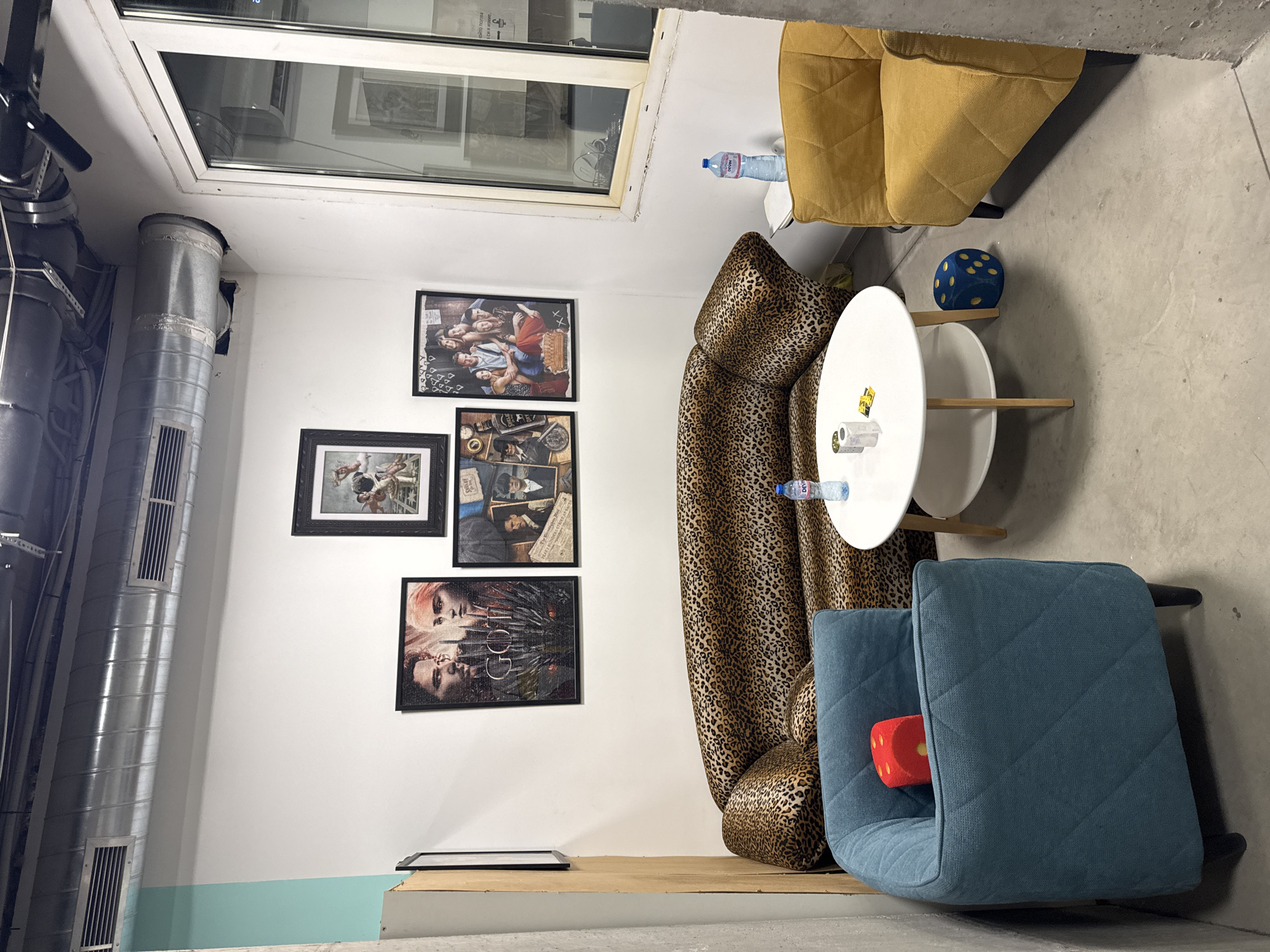 The image displays an indoor waiting area or lounge within a building, likely in Sofia, Bulgaria, given the presence of "Devin" branded water bottles. The space features a concrete floor and predominantly white walls, with a distinct vertical light turquoise stripe on the left wall. The ceiling reveals exposed metallic ductwork and pipes. Furniture comprises a large, curved sofa upholstered in a leopard print fabric, positioned against the back wall. To its left is a blue quilted armchair, and to its right, partially obscured by a concrete pillar, is a yellow quilted armchair. A round white coffee table with wooden legs is centrally located between the seating. Wall decor consists of five framed pictures above the sofa: a top-center image depicting a figure with a trophy, a left image featuring "Game of Thrones" characters, a bottom-left image showing "Peaky Blinders" characters, a bottom-right image of the "Friends" cast, and a right image resembling a classical painting. A portion of another framed picture is visible on the far left wall, adjacent to a light-colored wooden panel. Objects observed include a large red plush die resting in the blue armchair. On the coffee table are a blue plastic bottle of Devin mineral water, two small cylindrical items (possibly candle holders), and a yellow rectangular object. A large blue plush die is situated on the floor beneath the coffee table. A second blue plastic bottle of Devin mineral water is placed on a small white side table next to the yellow armchair. A large, white-framed window on the right wall offers a view into an adjacent interior space, reflecting an air conditioning unit. No individuals are present in the scene.