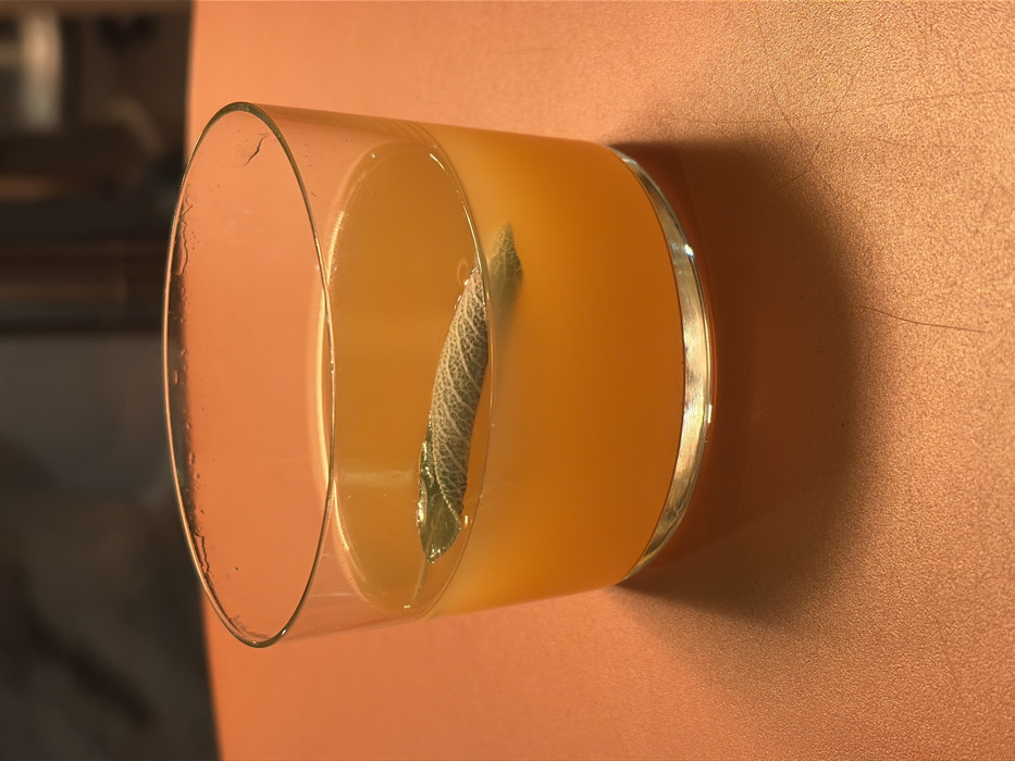 A sideways view depicts a glass containing an orange-colored liquid and a single sage leaf