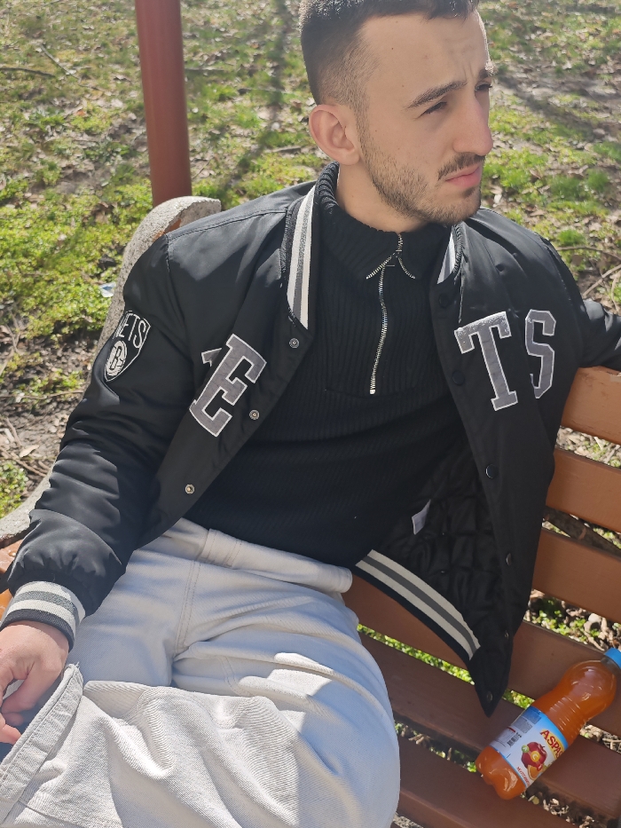 A young adult male is seated outdoors on a brown wooden slatted park bench in what appears to be a public green space in Sofia, Bulgaria. He is positioned in the center-right of the frame, looking towards his right, out of view. He has short, dark hair, a light stubble beard, and a serious expression. He wears a black ribbed turtleneck sweater with a silver quarter-zip zipper, layered under a black varsity jacket featuring white and grey striped cuffs and collar. The jacket has a circular "NETS" basketball logo patch on the left shoulder and large grey "TS" letters on the right front side. His lower body is clad in light grey or off-white corduroy-like trousers. His left hand rests on his leg. To his right, on the bench, an orange plastic bottle of "ASPASIA" brand fruit drink, displaying a label with fruit imagery, is visible. The background consists of green grass and sparse trees, indicating a sunny day in a park environment.