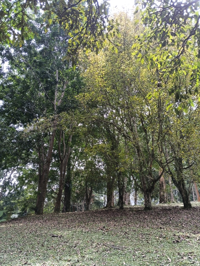 This image captures a forested landscape in Situm, Papua New Guinea. Numerous trees with varying shades of green and yellowish-green foliage dominate the scene, forming a dense canopy against a bright, overcast sky visible at the top. The ground in the foreground and midground is covered with green grass interspersed with a heavy scattering of dry, fallen leaves, gently sloping upward towards the denser tree line in the background. Visible tree trunks are dark and vertical. No individuals, animals, or artificial structures are present within the frame.