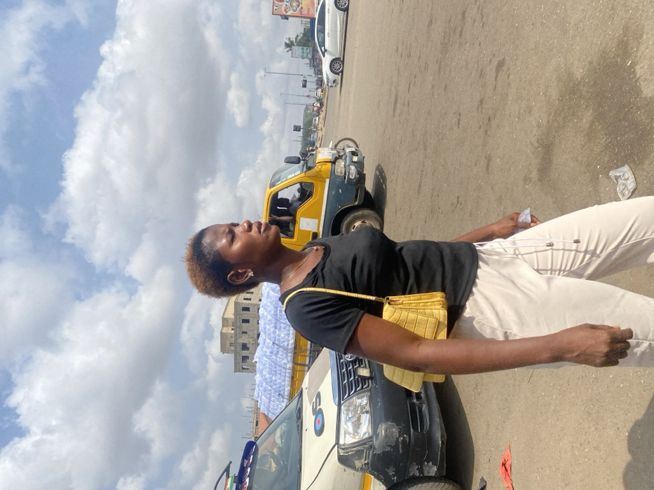 The image displays a daytime street scene in Ablekuma, Ghana. In the foreground, a young woman of African descent stands in profile, facing right. She has short, reddish-brown hair and wears a black short-sleeved top, light beige drawstring pants, and a yellow, textured shoulder bag. A single stud earring is visible in her left ear, and she wears a thin necklace. Her mouth is slightly open. In the mid-ground, a white van with a damaged front bumper and a blue circular logo (appearing as "O3") is positioned to the left. Adjacent to it, a yellow and blue utility truck is visible, with its bed loaded with numerous clear plastic bags, possibly containing sachet water. A person is discernible in the driver's seat of this truck. Further back, an unfinished multi-story concrete building stands under a partly cloudy sky. To the right, a white sedan and other distant vehicles are present on a road, indicating a thoroughfare. The ground is a paved surface with some scattered debris.