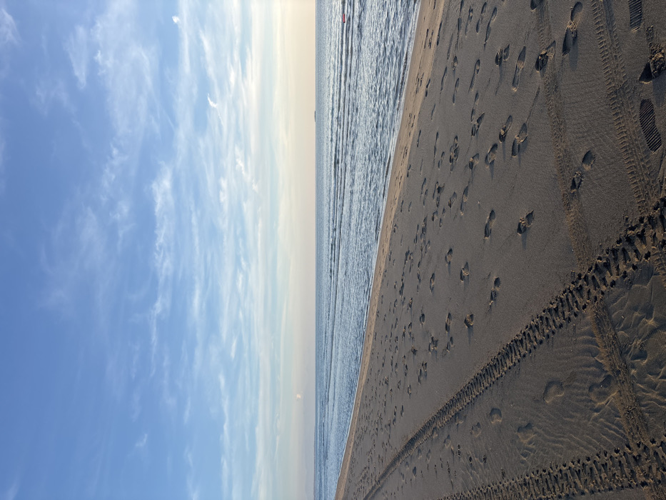 The image depicts a wide sandy beach in Donji Štoj, Montenegro, extending along a body of water under a partially clouded blue sky. The sandy foreground and middle ground exhibit numerous human footprints, varying in size and direction, interspersed with distinct vehicle tire tracks running parallel to the waterline on the left side. The water, appearing as the sea, shows gentle waves and a light ripple pattern. On the far horizon, a small, dark, oblong object is faintly visible. To the right, in the water, a singular red, rectangular-shaped object is partially submerged. The sky transitions from a lighter blue near the horizon to a deeper blue overhead, with scattered wispy white clouds. No individuals or active subjects are present in the scene.